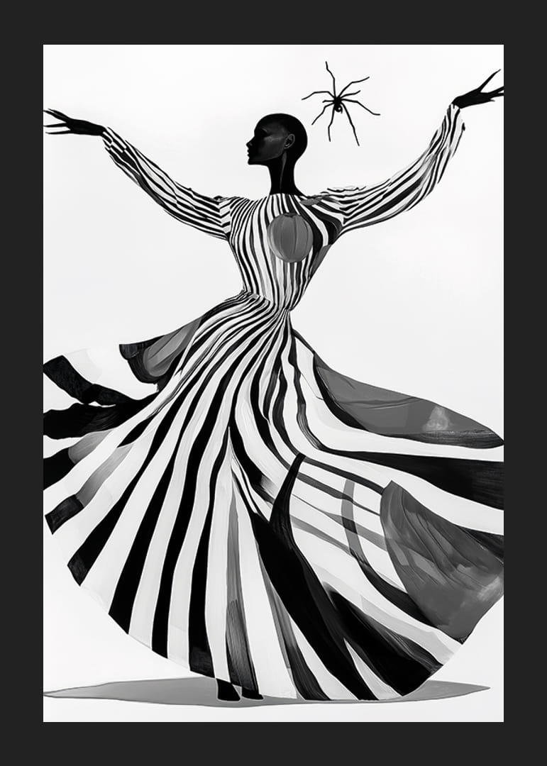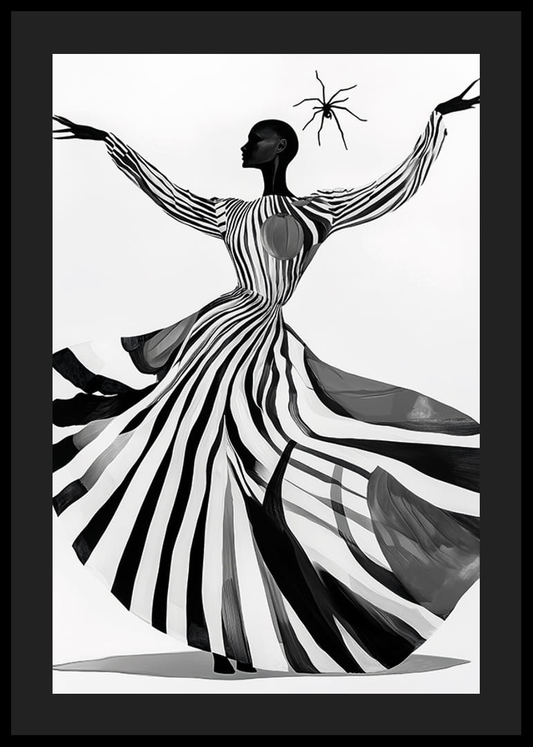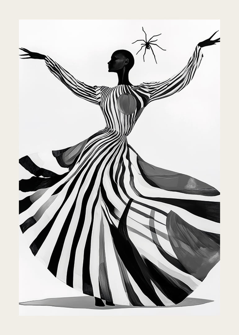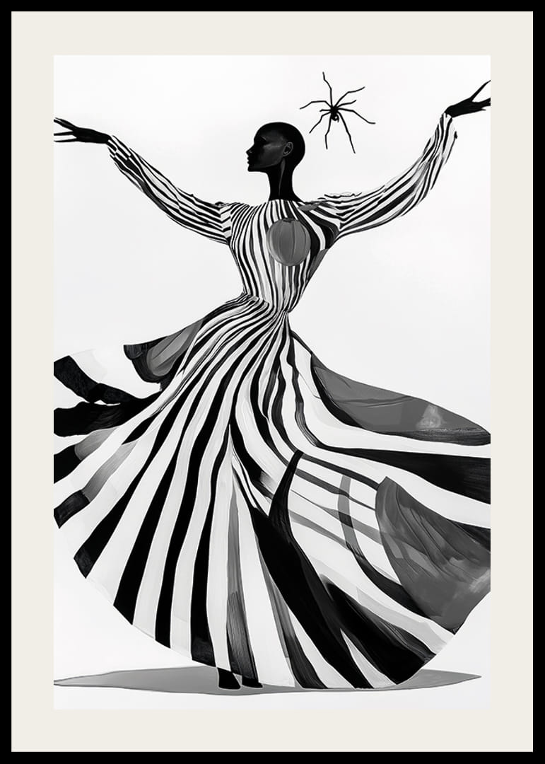 Questo poster cattura l'attenzione con il suo gioco ipnotico di strisce bianche e nere, dove un'elegante silhouette danza sullo sfondo. Il dinamismo del motivo accentua la sensazione di movimento e libertà, creando al contempo un'atmosfera misteriosa.