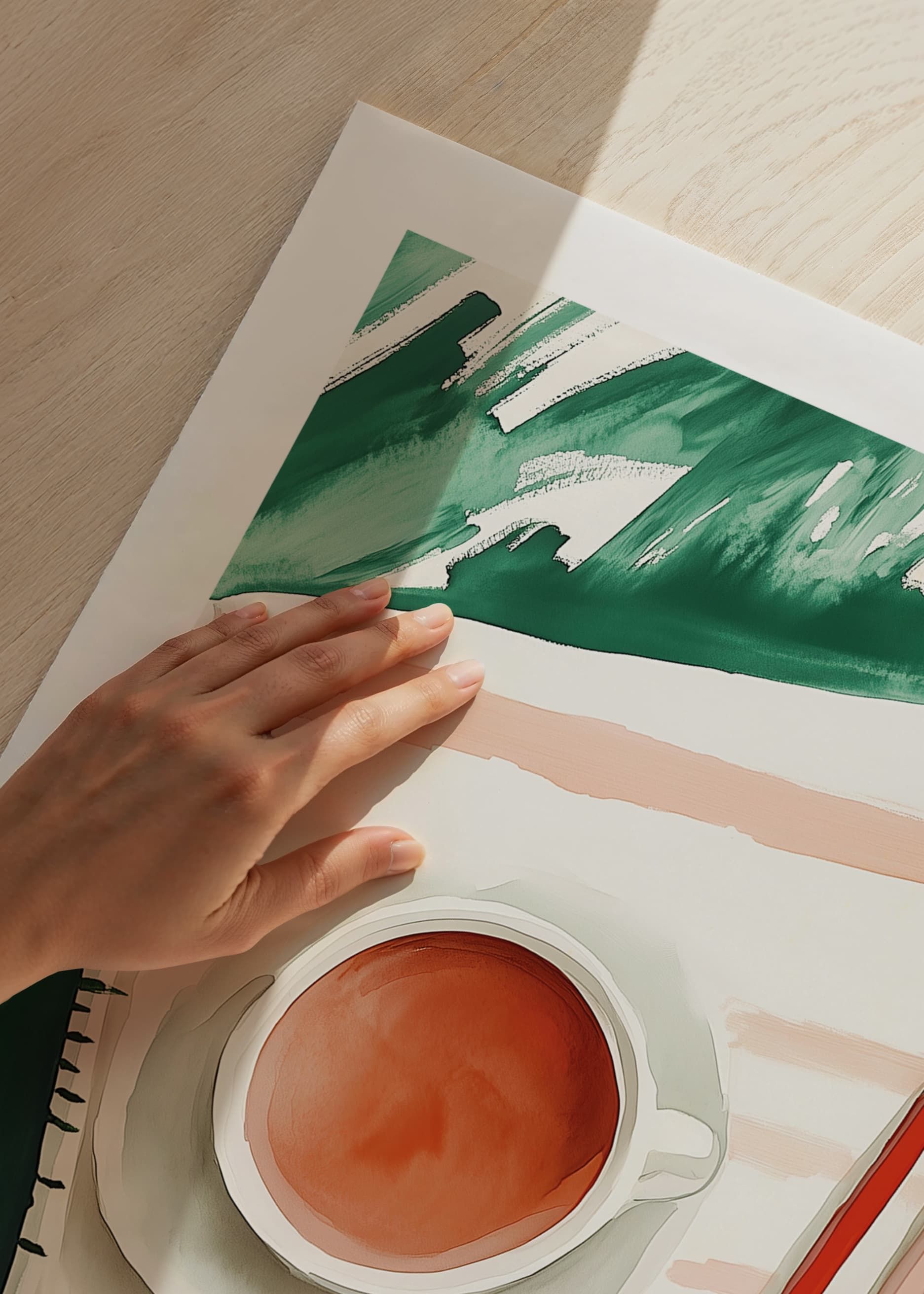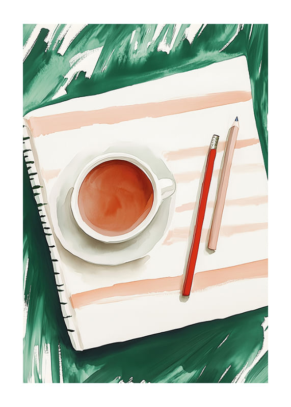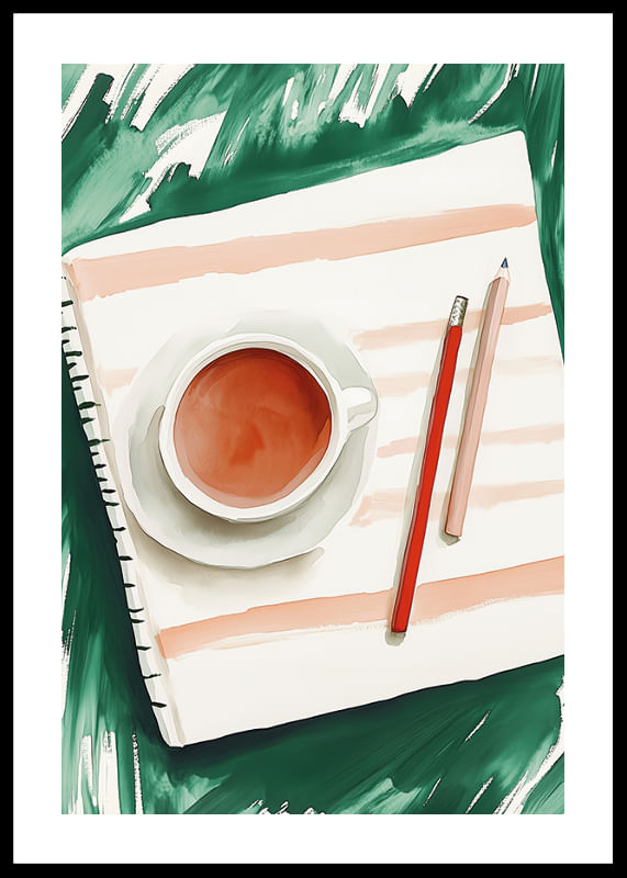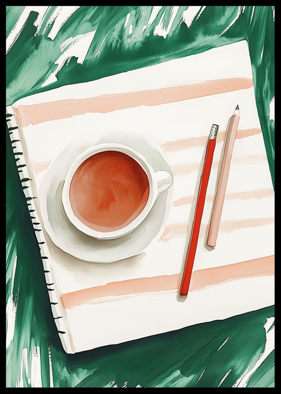Questo poster cattura un'istantanea di calma creativa, dove una tazza di tè fumante è accanto a carta e matite pronte per la creazione. Le delicate sfumature di colore si fondono con un senso di calma, che stimola la riflessione e lo sviluppo di idee.