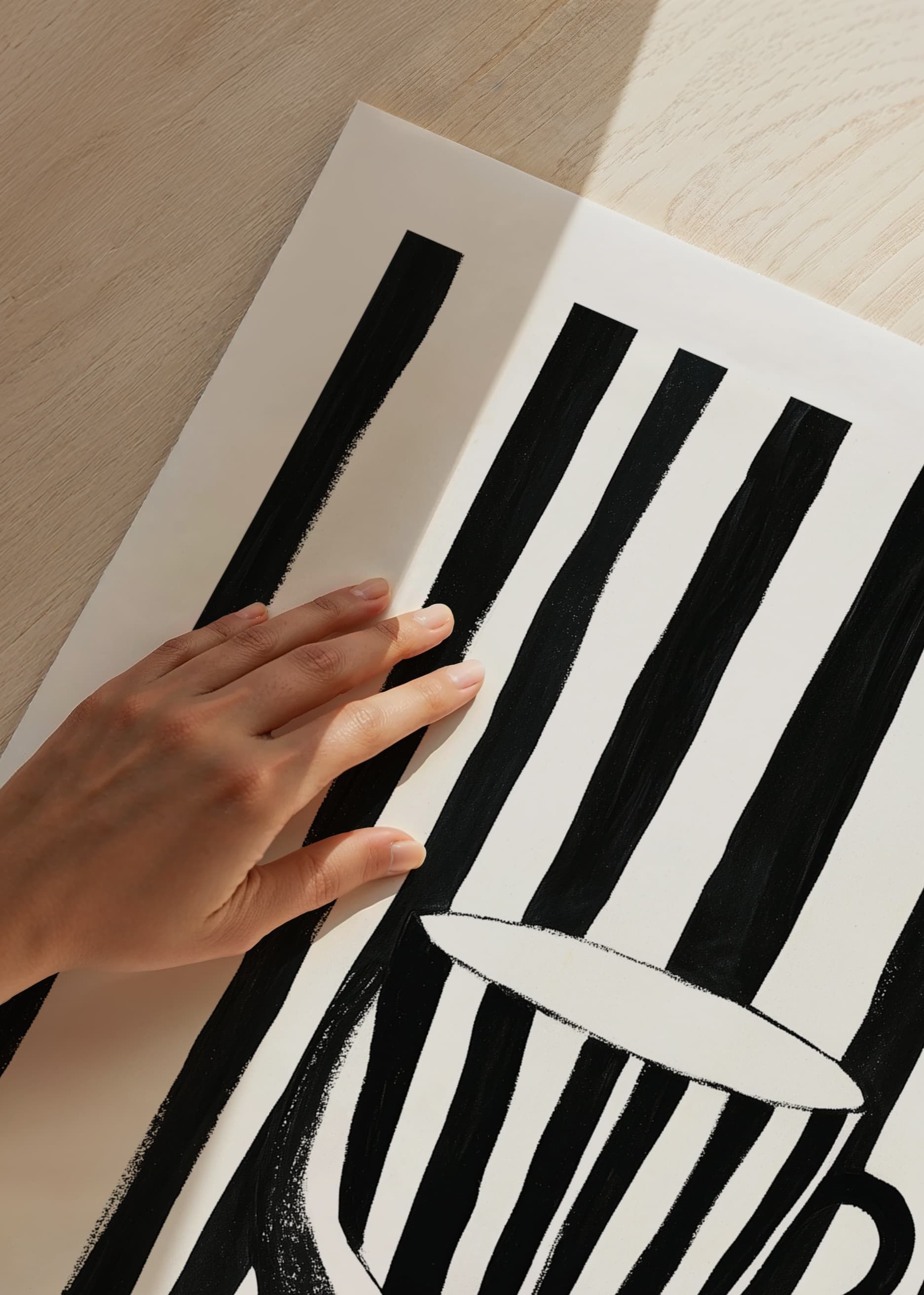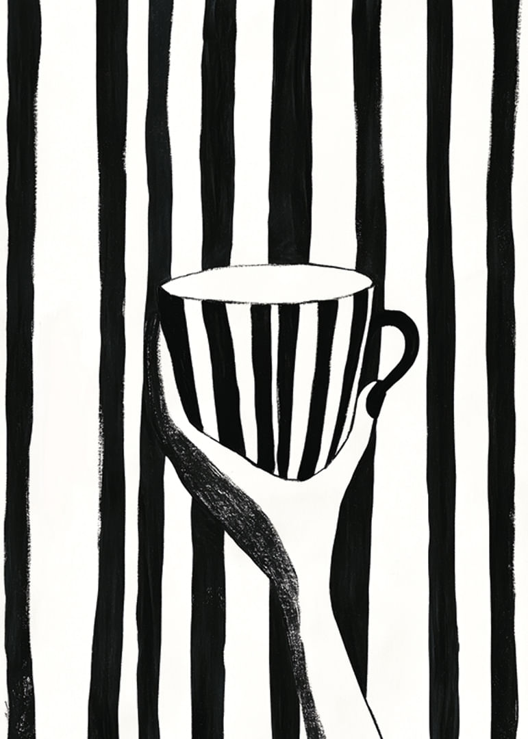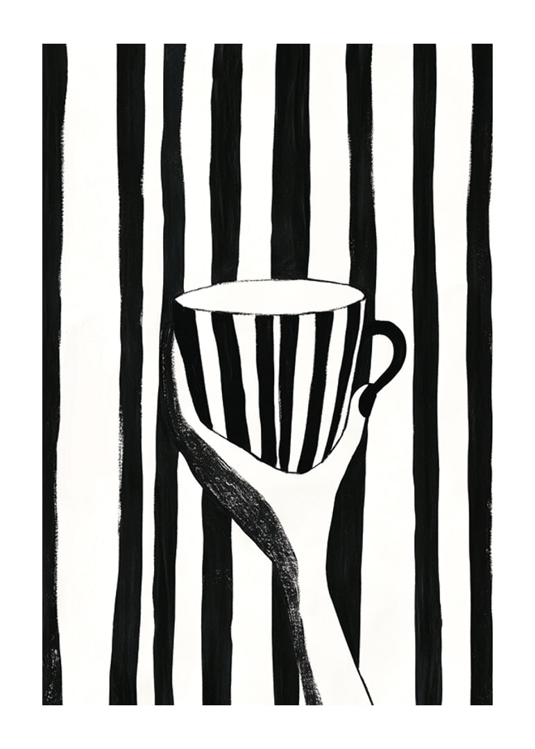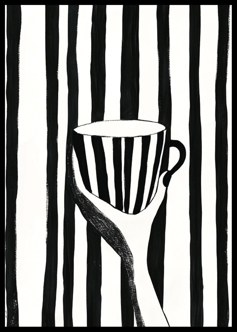 Con la sua pacata eleganza, questo poster cattura l'attenzione con le sue caratteristiche strisce bianche e nere. Una mano regge una tazza che si fonde con le linee decise dello sfondo, creando un intreccio ipnotico di forme e contrasti.