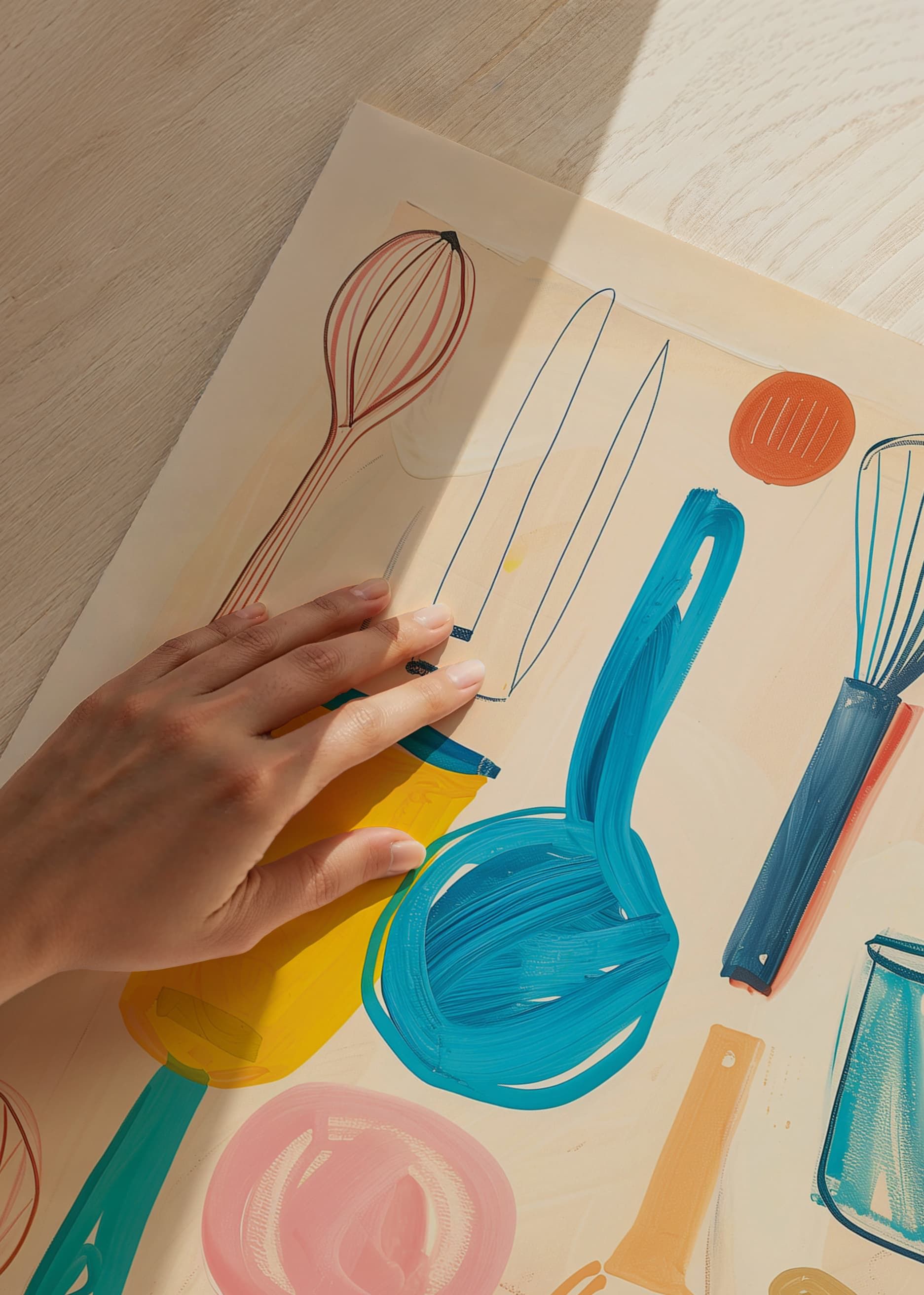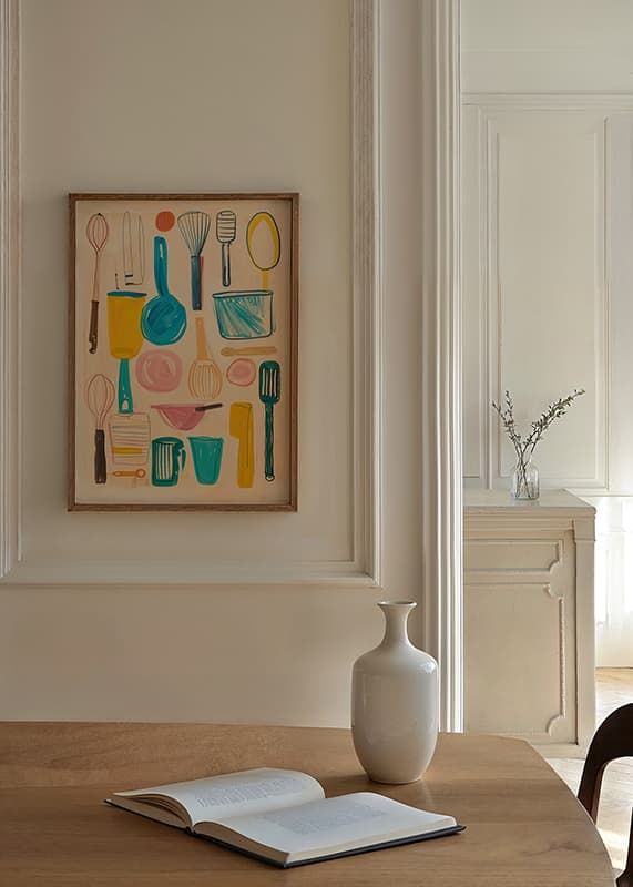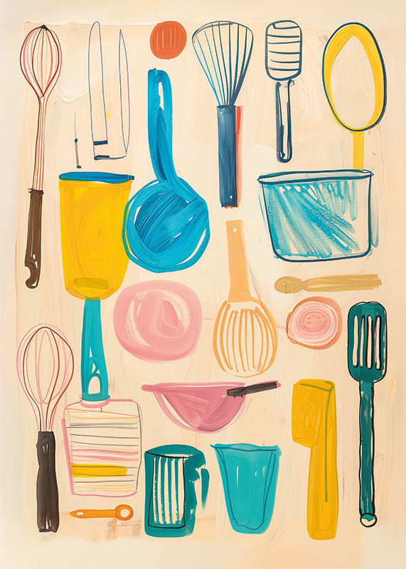 Questo poster cattura l'attenzione con i suoi colori vivaci e le raffigurazioni giocose degli utensili da cucina. Ogni pezzo è espresso attraverso forme astratte e pennellate audaci, creando un'atmosfera dinamica ed energizzante.