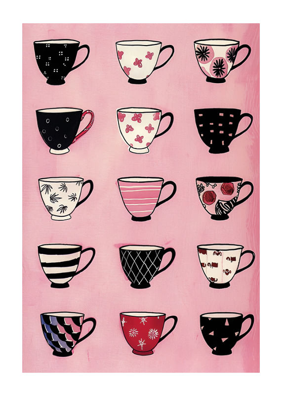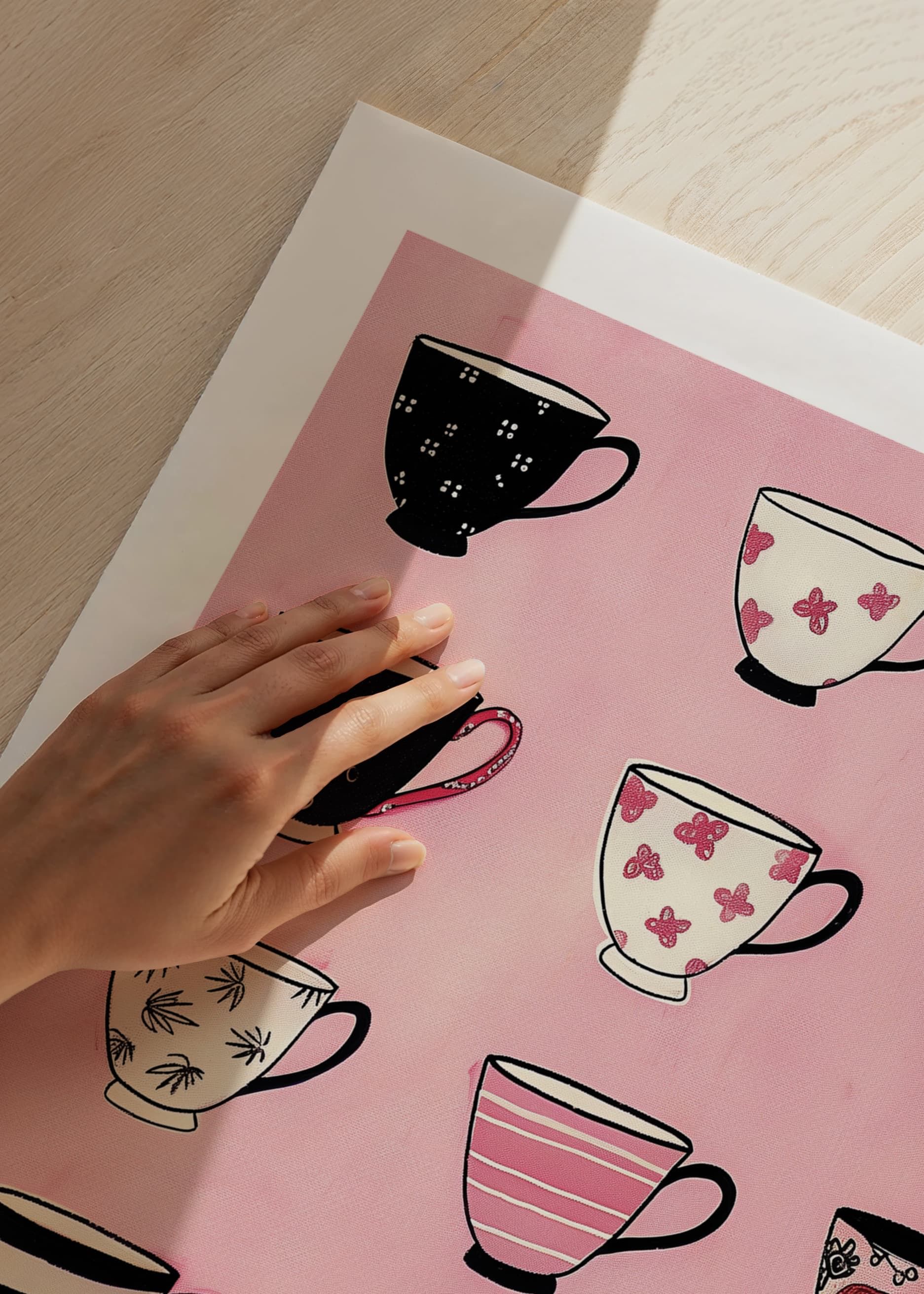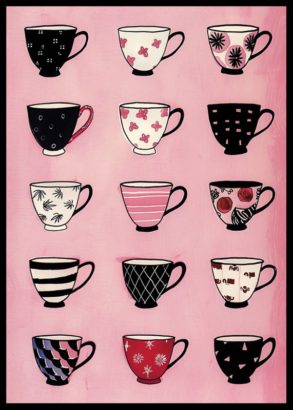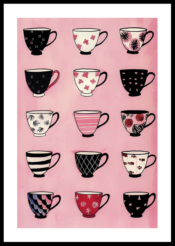 Questo poster cattura l'essenza della creatività con le sue graziose tazze decorate su uno sfondo rosa tenue. Ogni tazza ha il suo stile e la sua tavolozza di colori unici, creando un'incantevole sinfonia visiva.