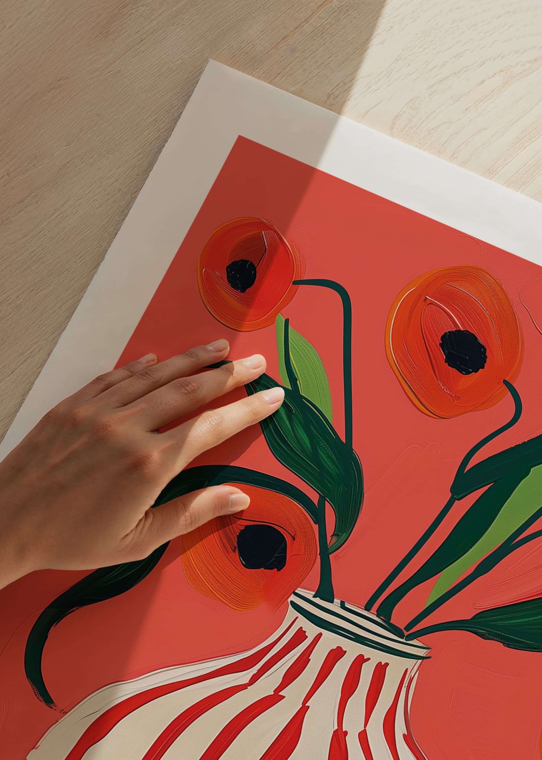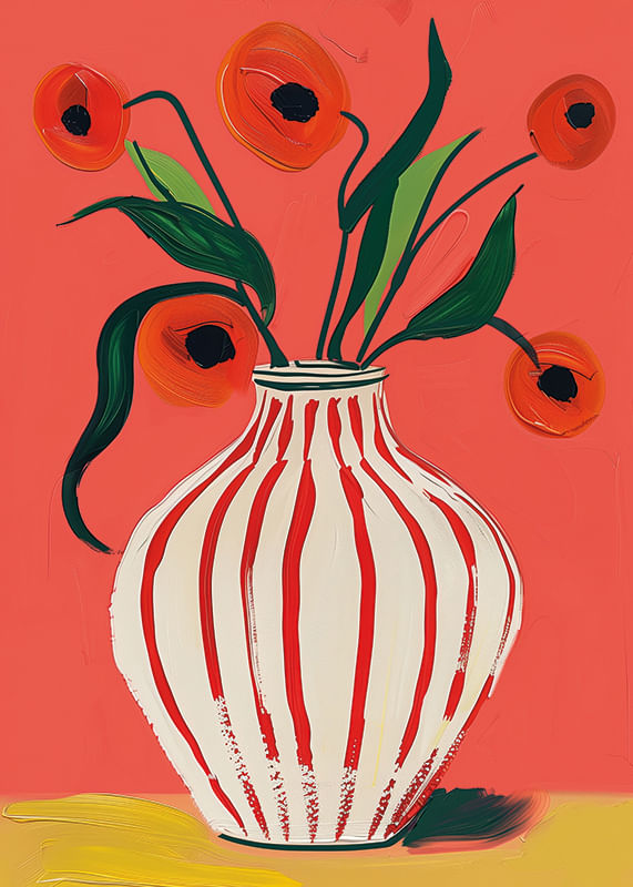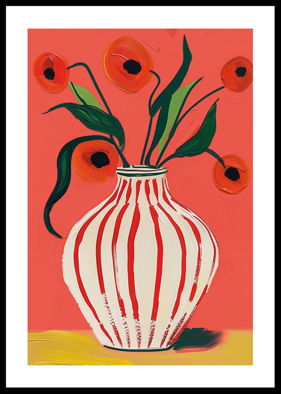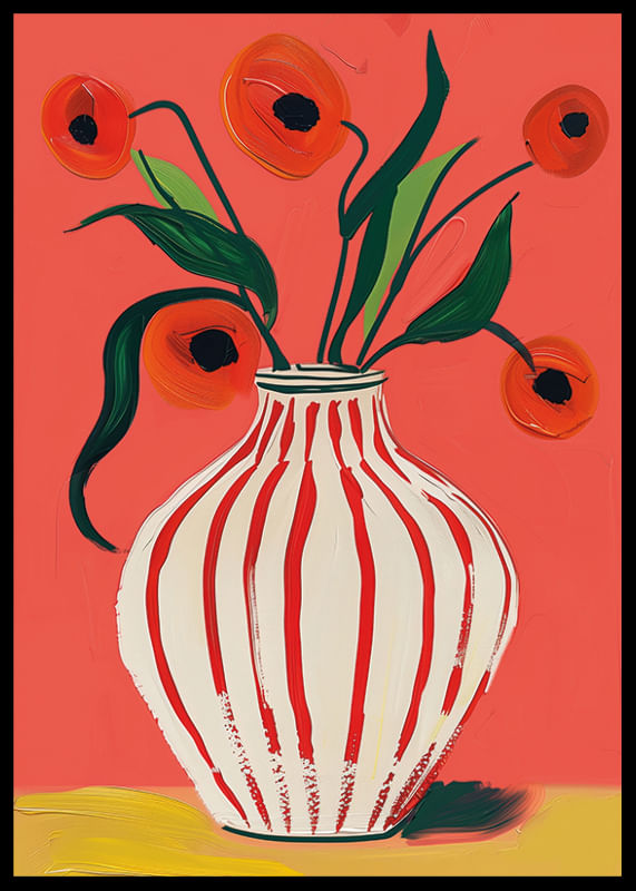 Questo poster cattura l'attenzione con la sua esplosiva tavolozza di colori, in cui i fiori rossi del papavero contrastano con uno sfondo vivace. L'eleganza del vaso a strisce aggiunge un movimento sottile all'intera composizione. I fiori, dipinti con pennellate vivaci, creano una sensazione di freschezza ed energia.