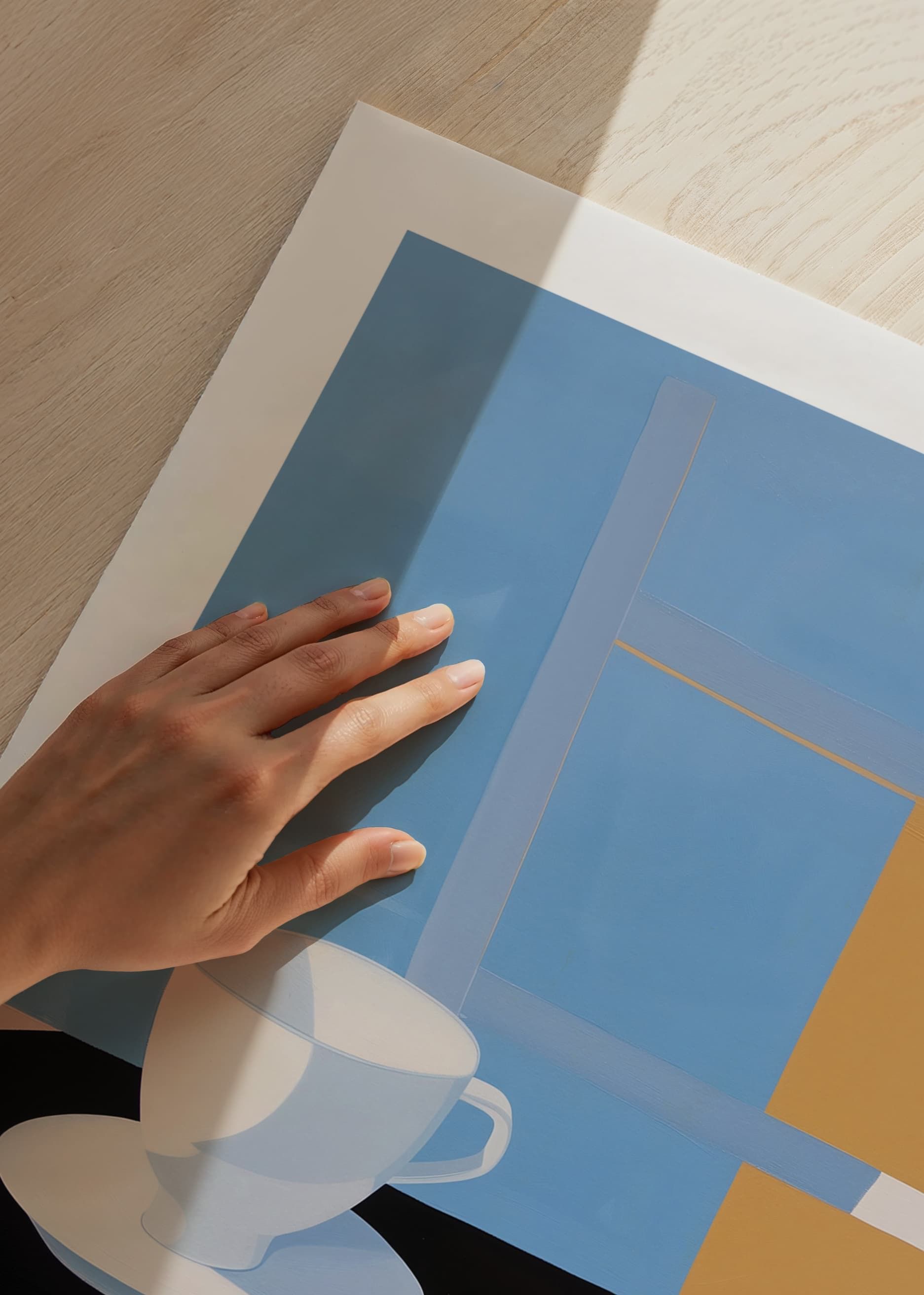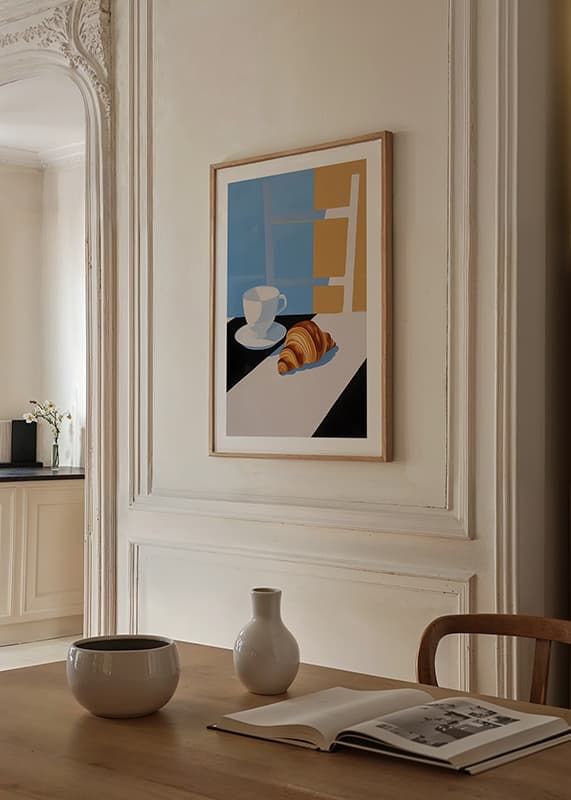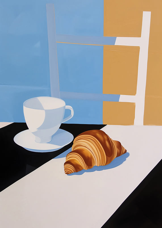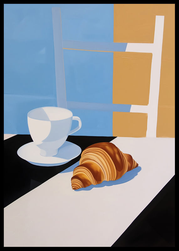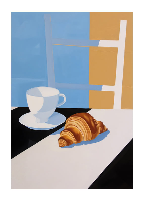 Questo poster cattura la sensazione semplice ma sofisticata di una mattina tranquilla. Con un'elegante tazza da caffè e un croissant cotto alla perfezione, su uno sfondo di tenui colori pastello, offre un'esperienza visiva di calma e armonia.