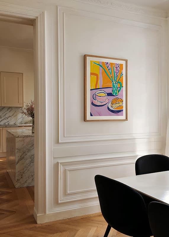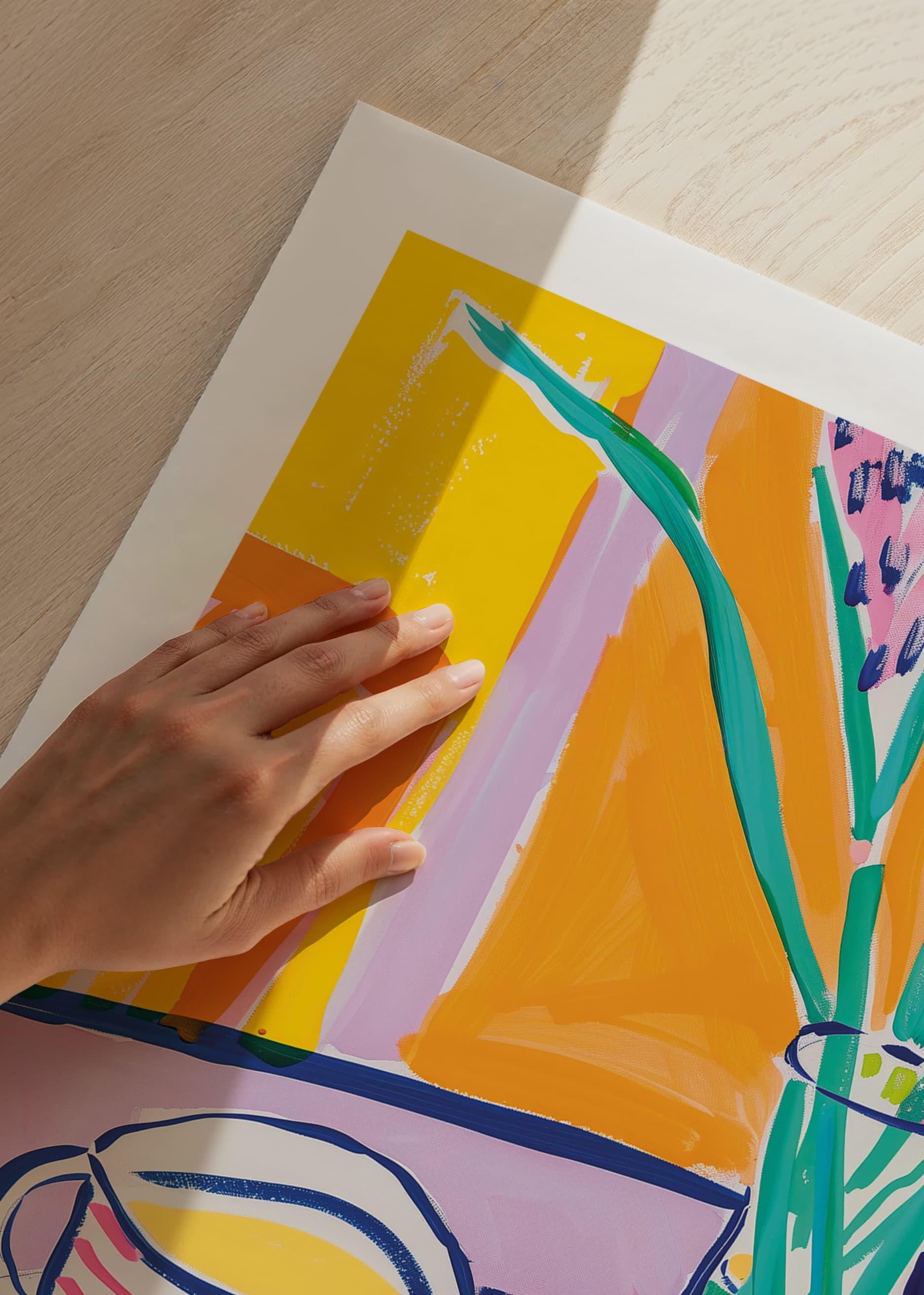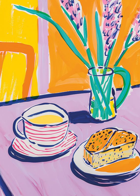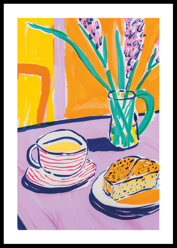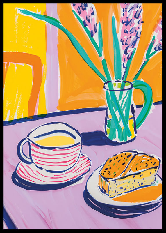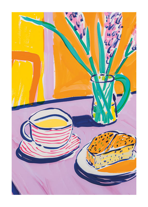 Un poster vivace che cattura l'essenza di una mattina di sole, con una tazza di tè fumante e una succosa fetta di torta appoggiata su un tavolo viola. I colori vivaci dell'arancione e del giallo circondano la composizione, mentre i fiori freschi nel vaso verde aggiungono un senso di primavera.