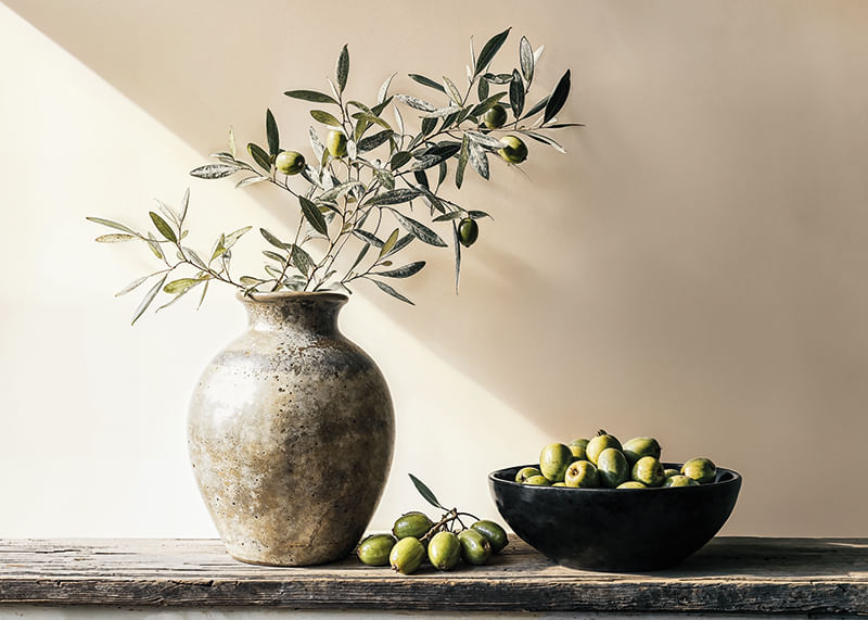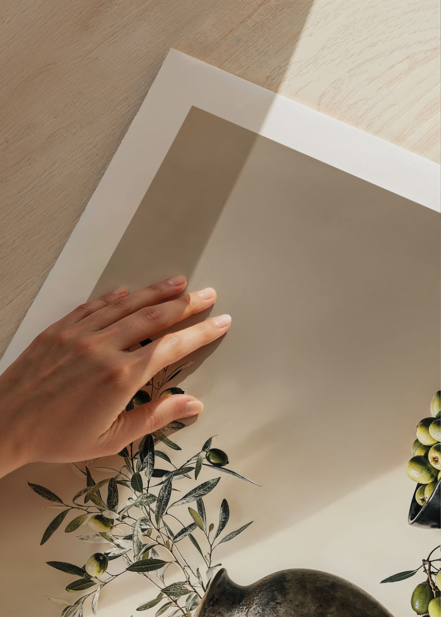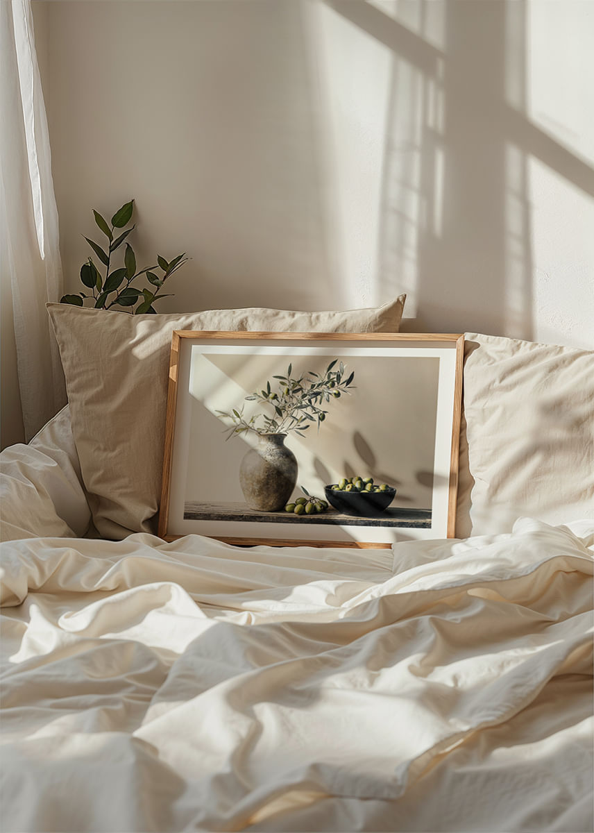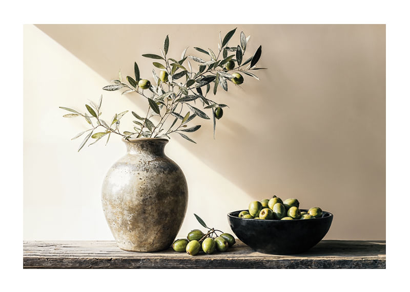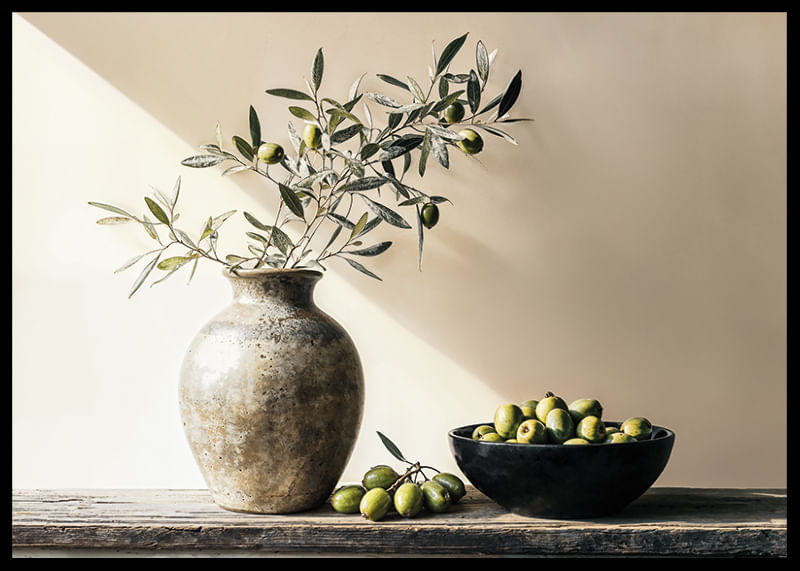 Questo poster cattura l'essenza della bellezza senza tempo con i suoi delicati rami d'ulivo disposti in un vaso rustico accanto a una ciotola piena di olive mature. La luce crea un morbido gioco di ombre che riempie la stanza di un senso di calma e semplicità.