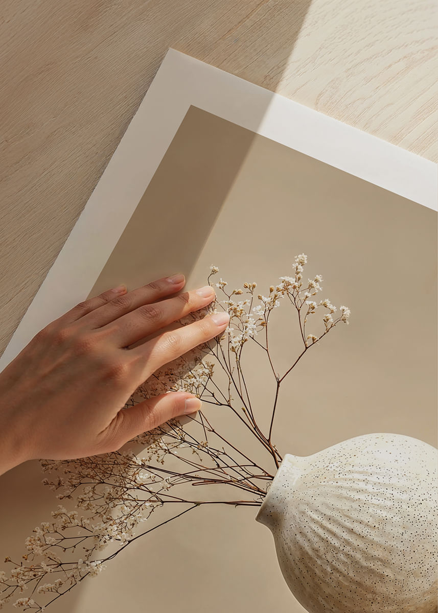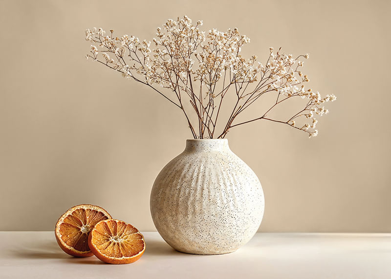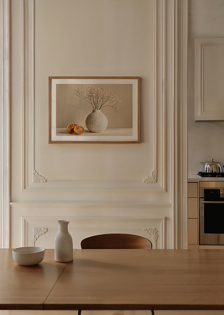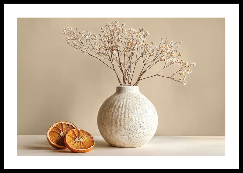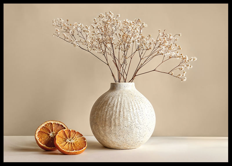 Questo poster trasmette una sensazione di calma creata dalla semplice eleganza del vaso rustico su uno sfondo neutro. I fiori secchi e le fette d'arancia tagliate a metà aggiungono una delicata bellezza naturale, illuminando la stanza con un senso di pace ed equilibrio.