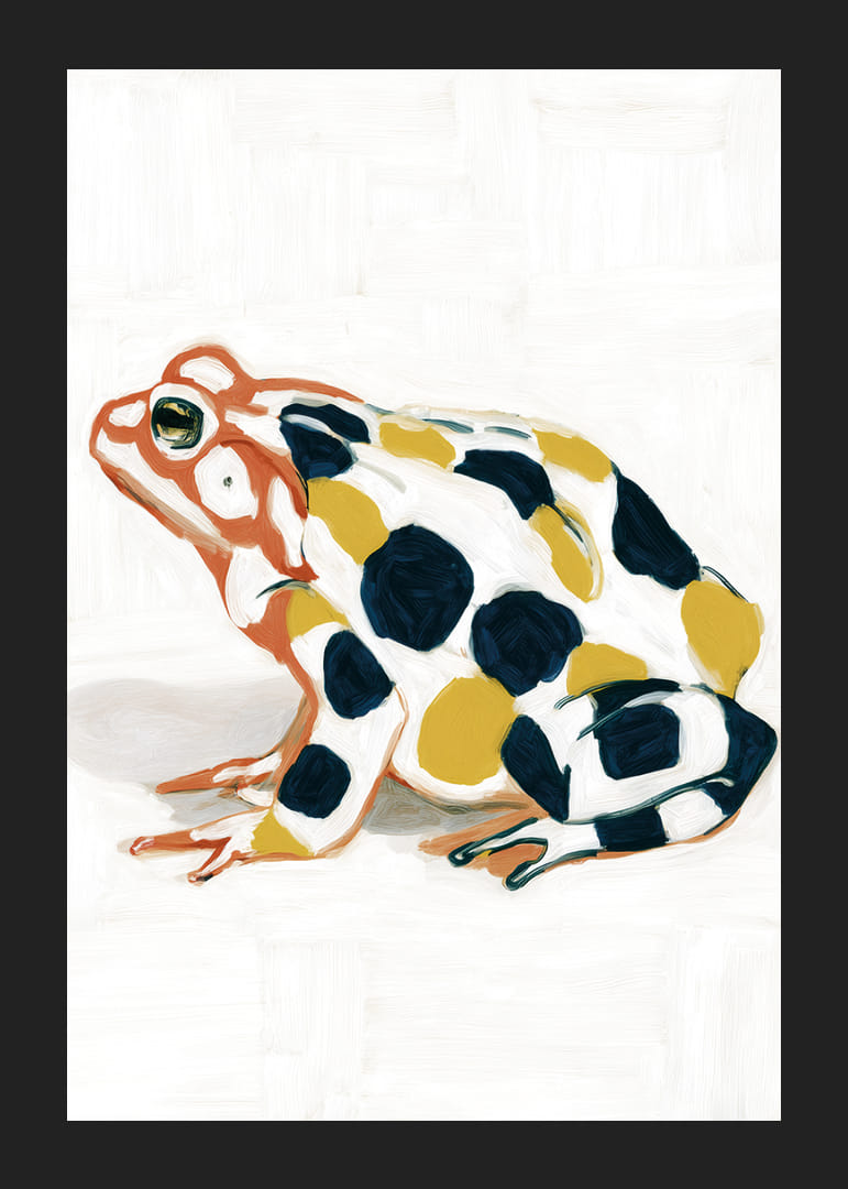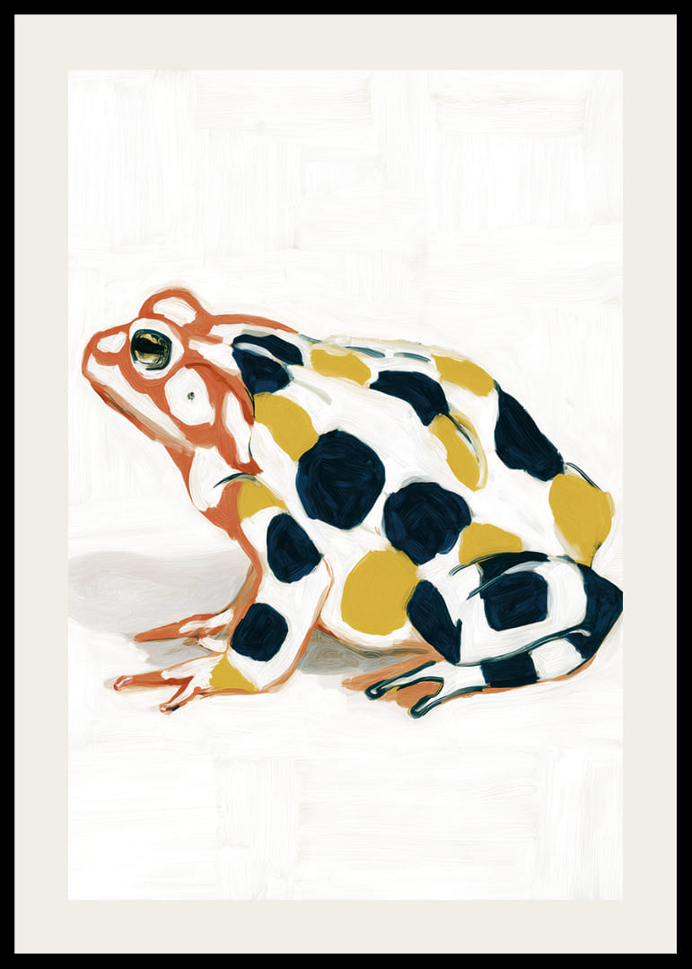 Un sorprendente poster di una rana con motivi dai colori intensi cattura immediatamente l'attenzione. Le vivaci macchie gialle e blu sullo sfondo bianco creano un forte contrasto che mette in risalto la presenza armoniosa e calma della rana. Questo poster aggiunge un tocco artistico a qualsiasi stanza e accentua un senso di giocosità e bellezza naturale nella tua casa.