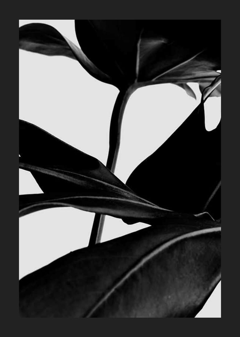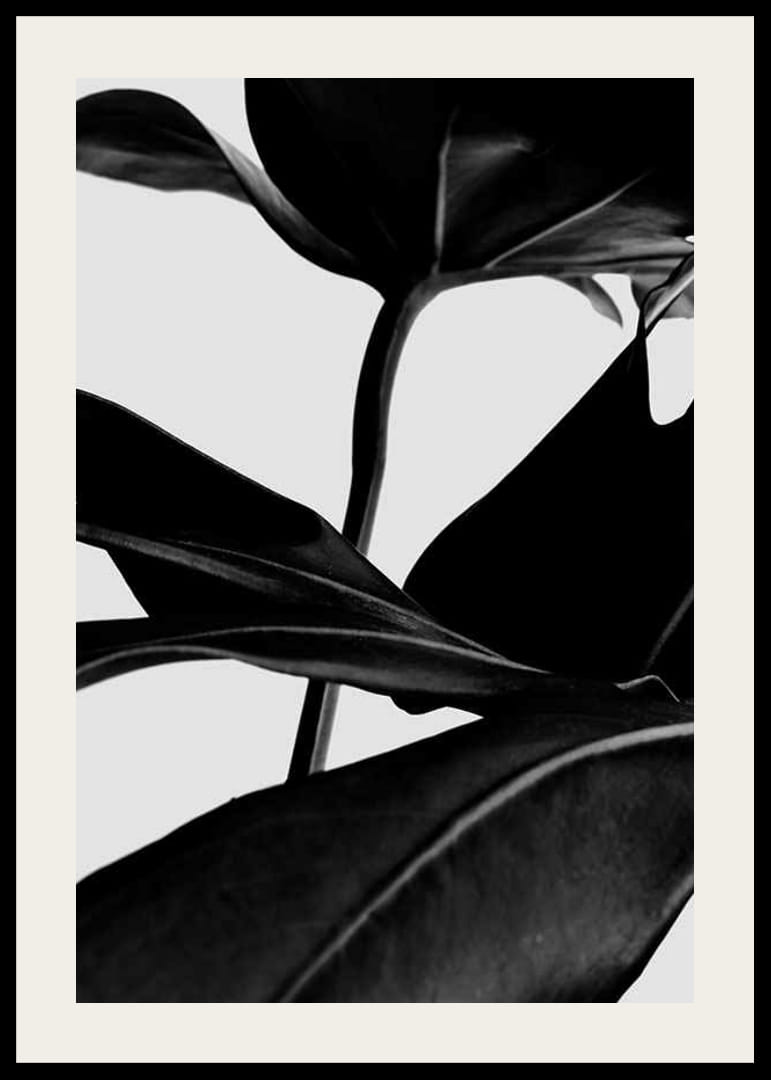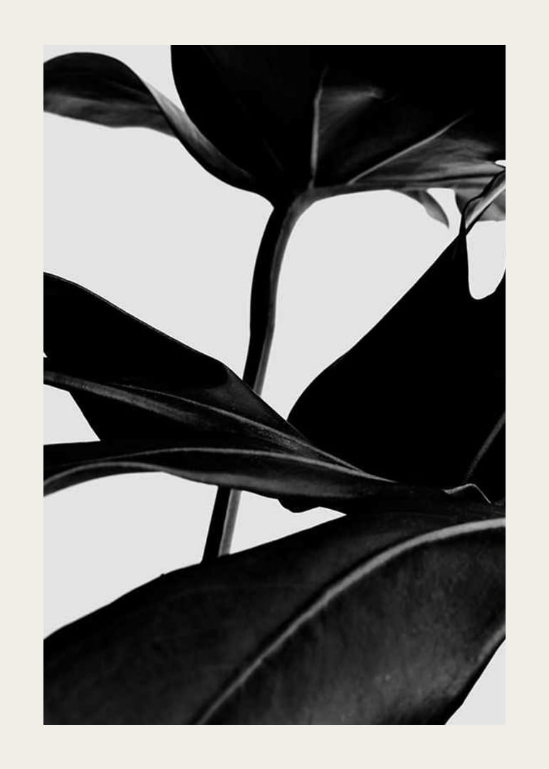 Un primo piano di foglie di ficus nei toni del bianco e nero, con le foglie ben visibili su uno sfondo chiaro e neutro. Le ombreggiature morbide e le linee semplici creano un'espressione grafica che conferisce un tocco di stile. Questo poster si adatta bene a qualsiasi ambiente, dai soggiorni moderni alle cucine e agli uffici, dove gli elementi naturali sono apprezzati.