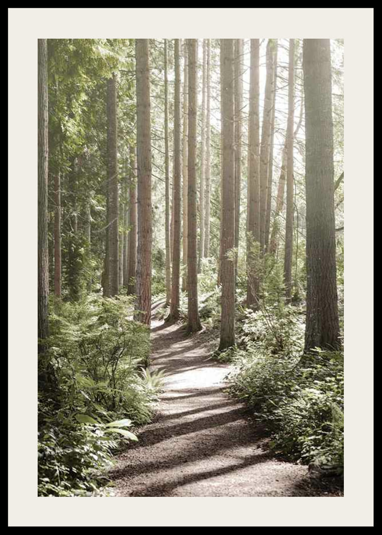 Un sentiero di ghiaia chiara si snoda attraverso una fitta foresta verde, con tronchi alti e dritti e un sottobosco rigoglioso. La luce del sole filtra tra il fogliame, creando morbide ombre sul terreno. Questo poster dona un tocco naturale ed è perfetto per camere da letto, soggiorni o studi, per chi desidera immergersi nella natura.