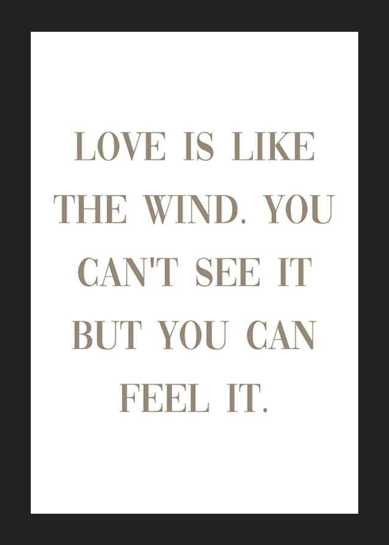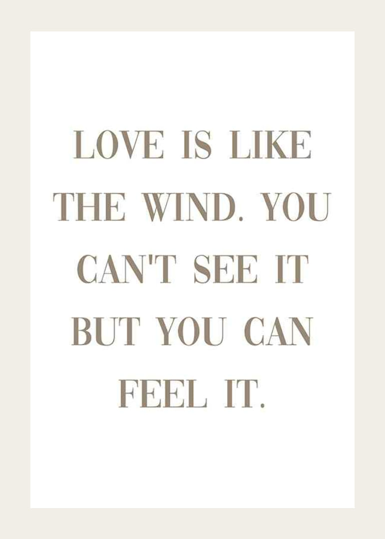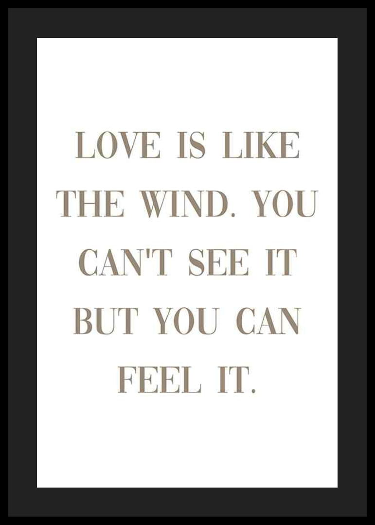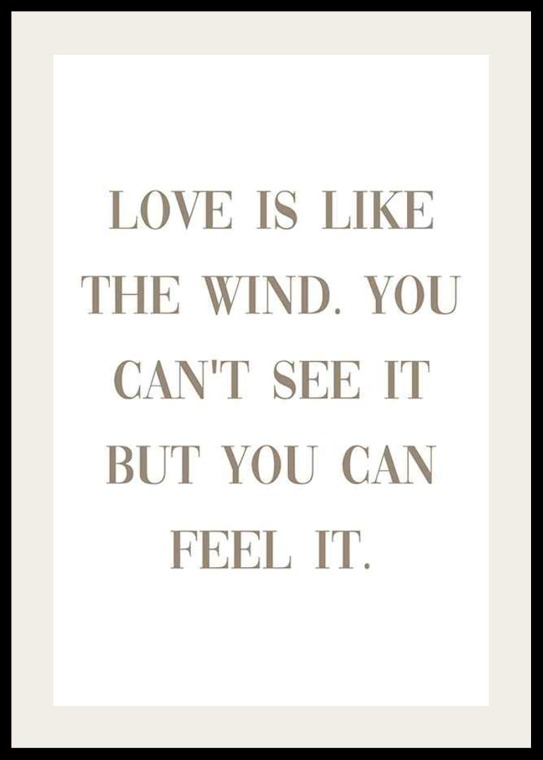 Elegante testo in maiuscolo con la scritta "L'amore è come il vento. Non lo vedi, ma lo senti". Il testo è stampato in marrone chiaro su uno sfondo completamente bianco, che conferisce un'espressione minimalista e moderna. Questo poster si adatta a una camera da letto o a un soggiorno e crea un'atmosfera accogliente con il suo messaggio semplice.