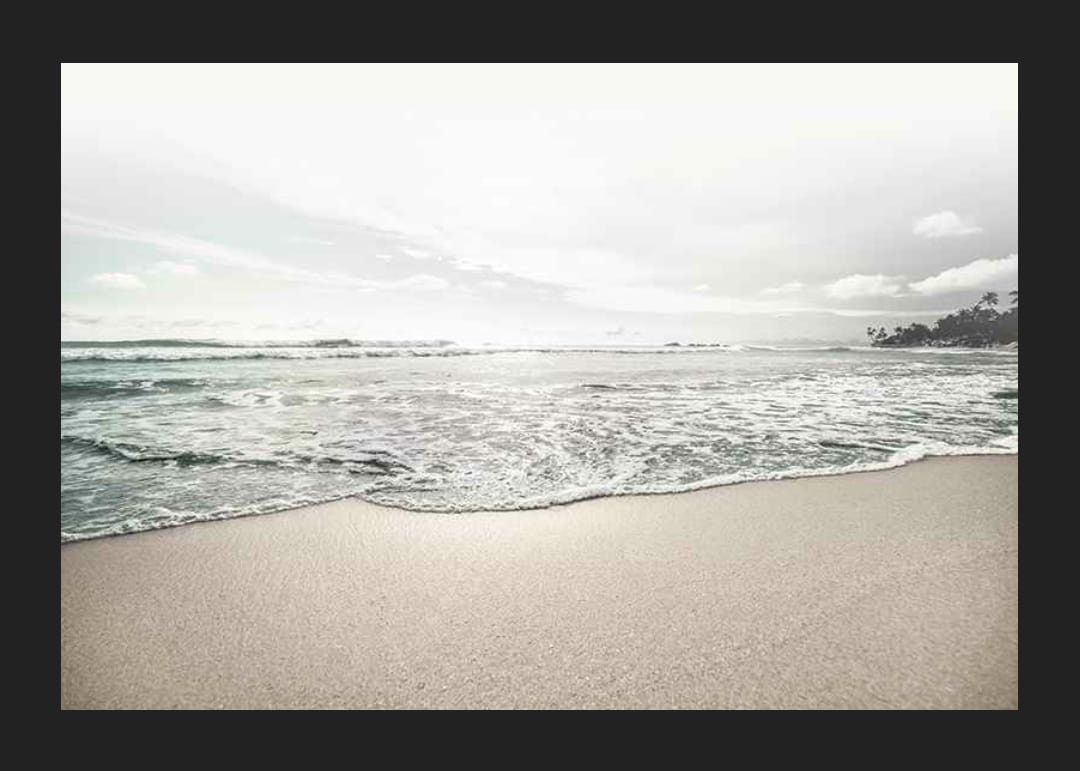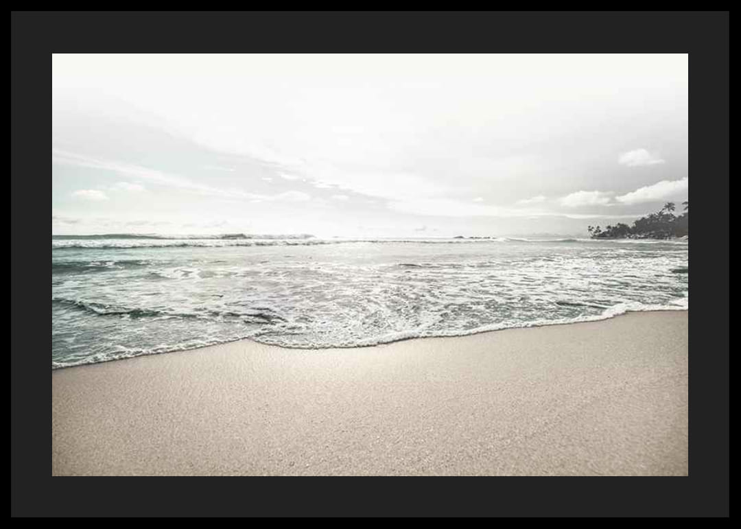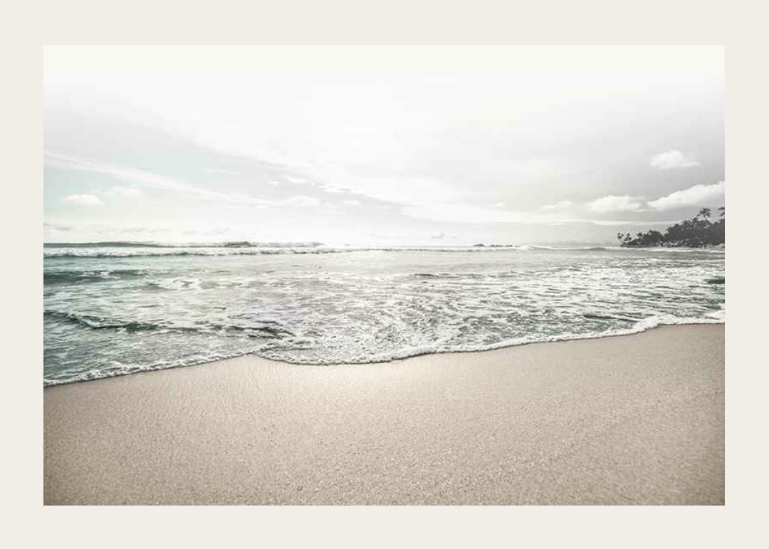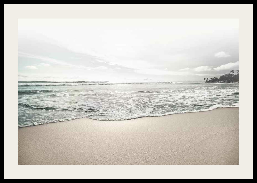 Paesaggio marino con onde che si infrangono dolcemente su una spiaggia di sabbia chiara sotto un cielo pallido e leggermente coperto. Più in lontananza, si intravedono sagome di alberi contro l'orizzonte. Questo poster trasmette una sensazione di vastità estiva e si adatta bene sia al soggiorno che alla camera da letto, dove si desidera un'atmosfera calma e aperta.