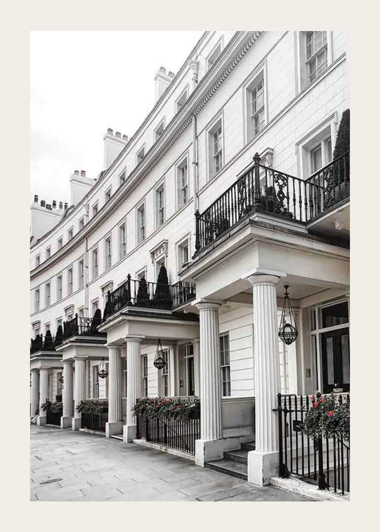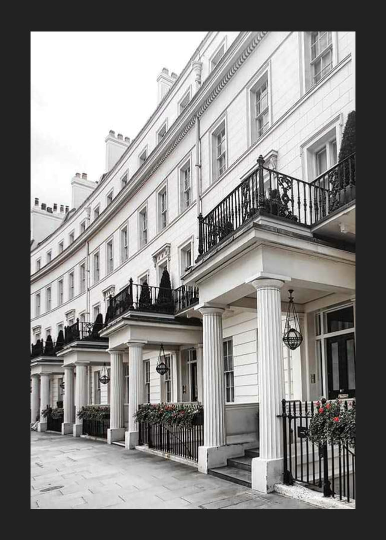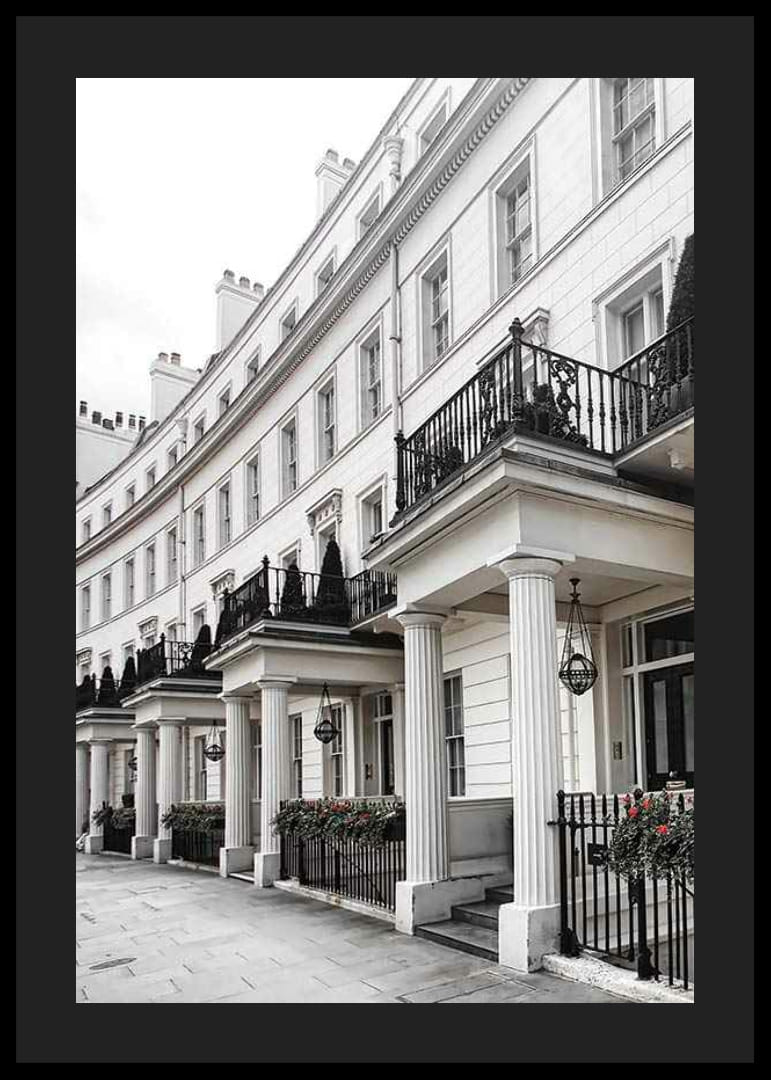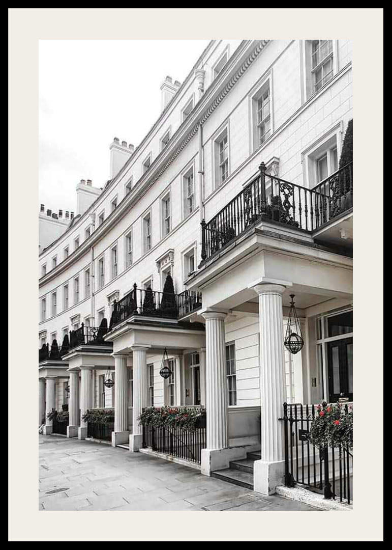 Facciate bianche in stile georgiano con alte finestre, balconi in ferro battuto nero e colonne classiche adornano una fila di case ben curate nel quartiere di Belgravia, una delle zone residenziali più esclusive di Londra. Fioriere e arbusti sferici aggiungono un tocco di verde discreto lungo il marciapiede. Questo poster aggiunge un tocco architettonico senza tempo alla tua casa, soprattutto in soggiorno o in corridoio.