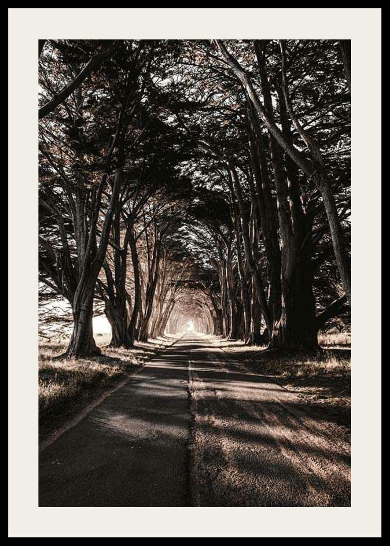 Un viale di alberi ad alto fusto forma un arco sopra una stretta strada di campagna, dove la luce filtra tra i rami e le ombre si allungano sulla strada. I toni caldi del marrone e quelli tenui conferiscono al motivo una delicata impressione autunnale. Questo poster ispirato alla natura è perfetto per un corridoio, un soggiorno o un ufficio, per un'atmosfera naturale.