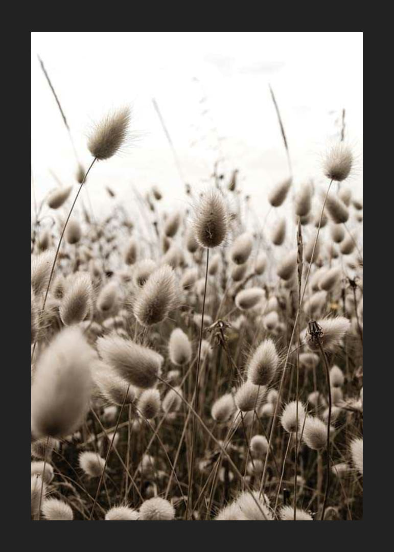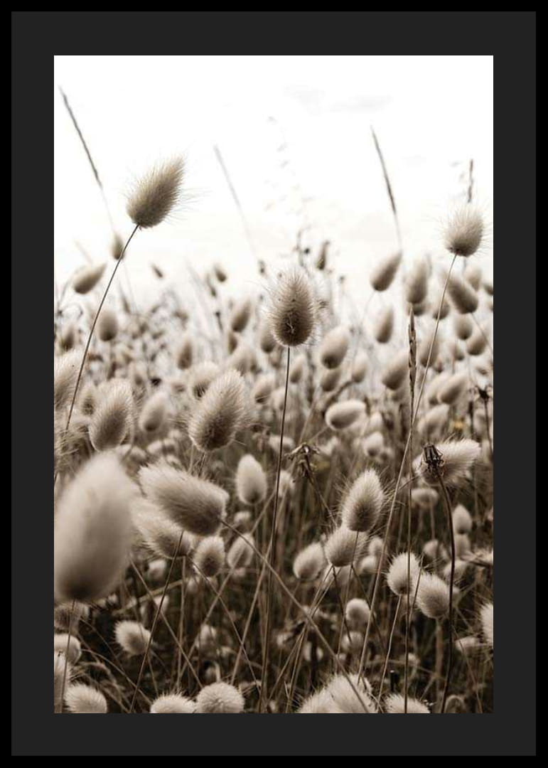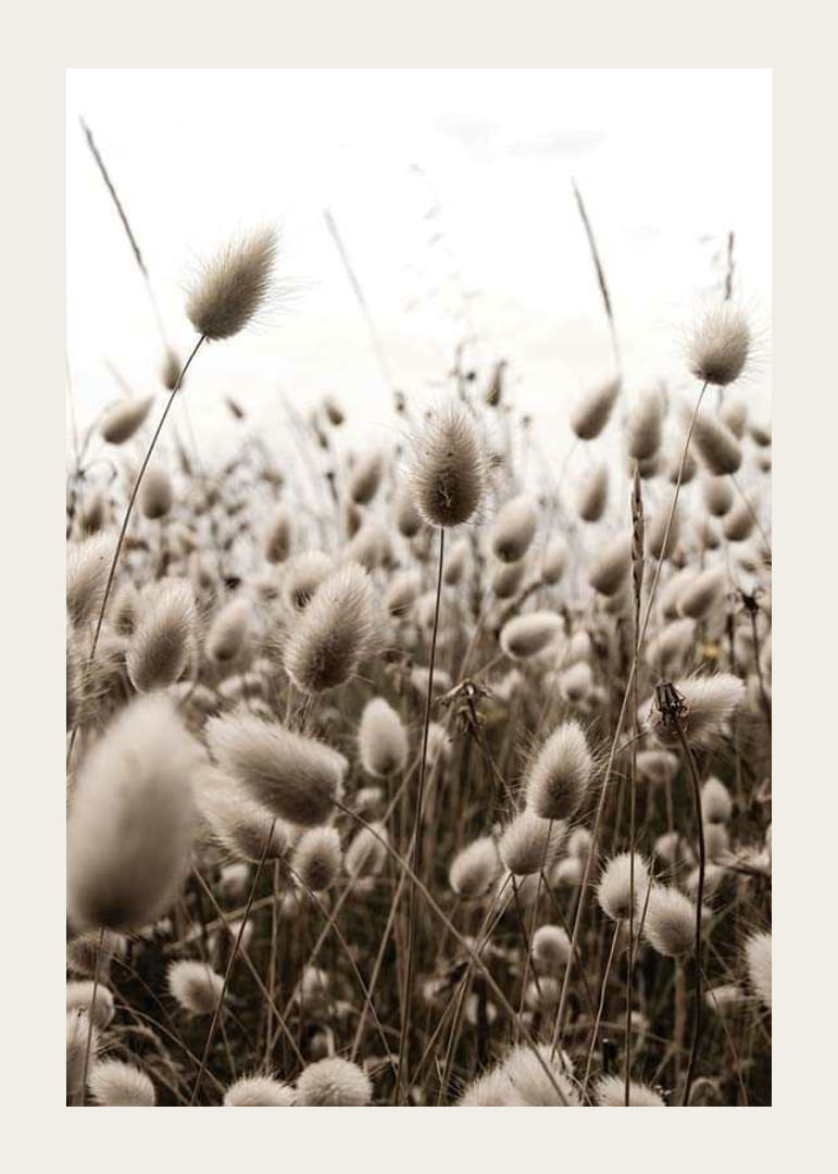 Primo piano di canne e fili d'erba secchi in delicate tonalità di marrone e beige, contro un cielo luminoso. La composizione è dominata dai soffici fili d'erba che si estendono su tutto il soggetto, creando un'impressione di naturalezza e serenità. Questo poster aggiunge un tocco di terrosità, ad esempio, a un soggiorno o a un corridoio.