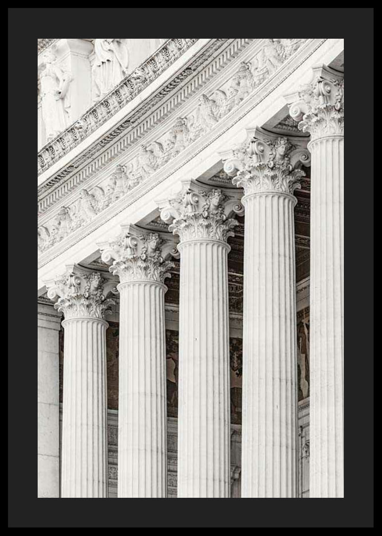 Colonne in marmo classiche con capitelli corinzi decorati sono al centro dell'attenzione, immortalate in una fotografia di un edificio storico di Roma. I toni chiari del bianco e del grigio mettono in risalto i dettagli architettonici. Un poster che dona un'atmosfera senza tempo e si adatta a stanze in cui si desidera un'ispirazione architettonica.
