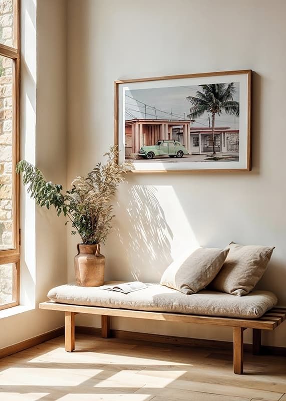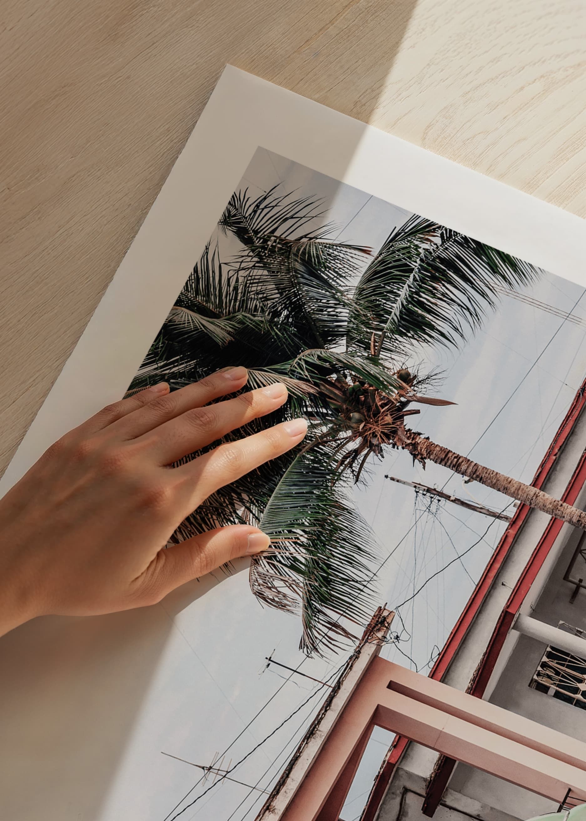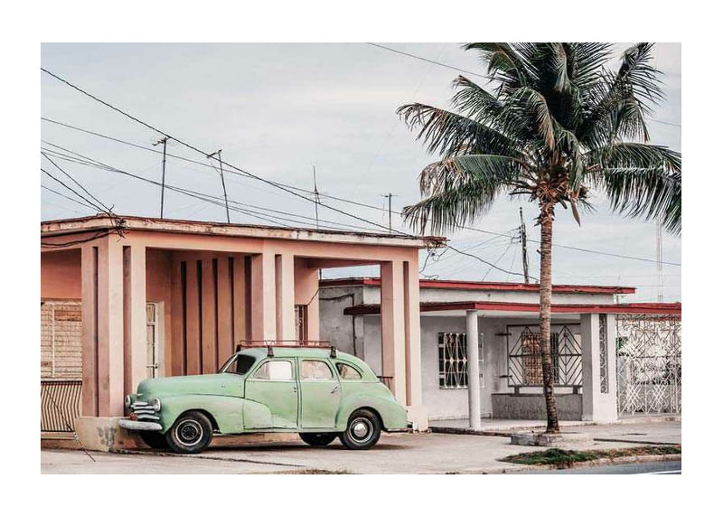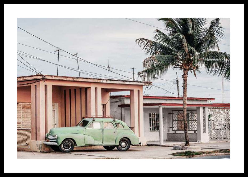 Un'auto d'epoca americana verde chiaro è parcheggiata davanti a una casa rosa pastello, con una palma e diversi cavi elettrici sullo sfondo. Le case basse e il cielo aperto creano una distinta atmosfera caraibica. Questo poster aggiunge un tocco nostalgico ed estivo alle stanze in cui si desidera un'atmosfera rilassata.