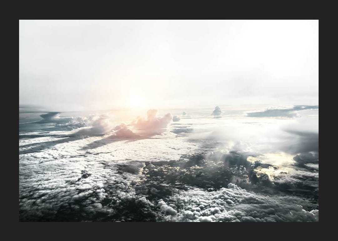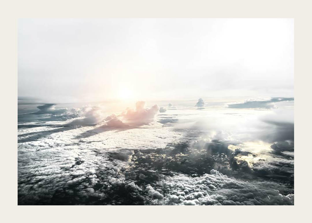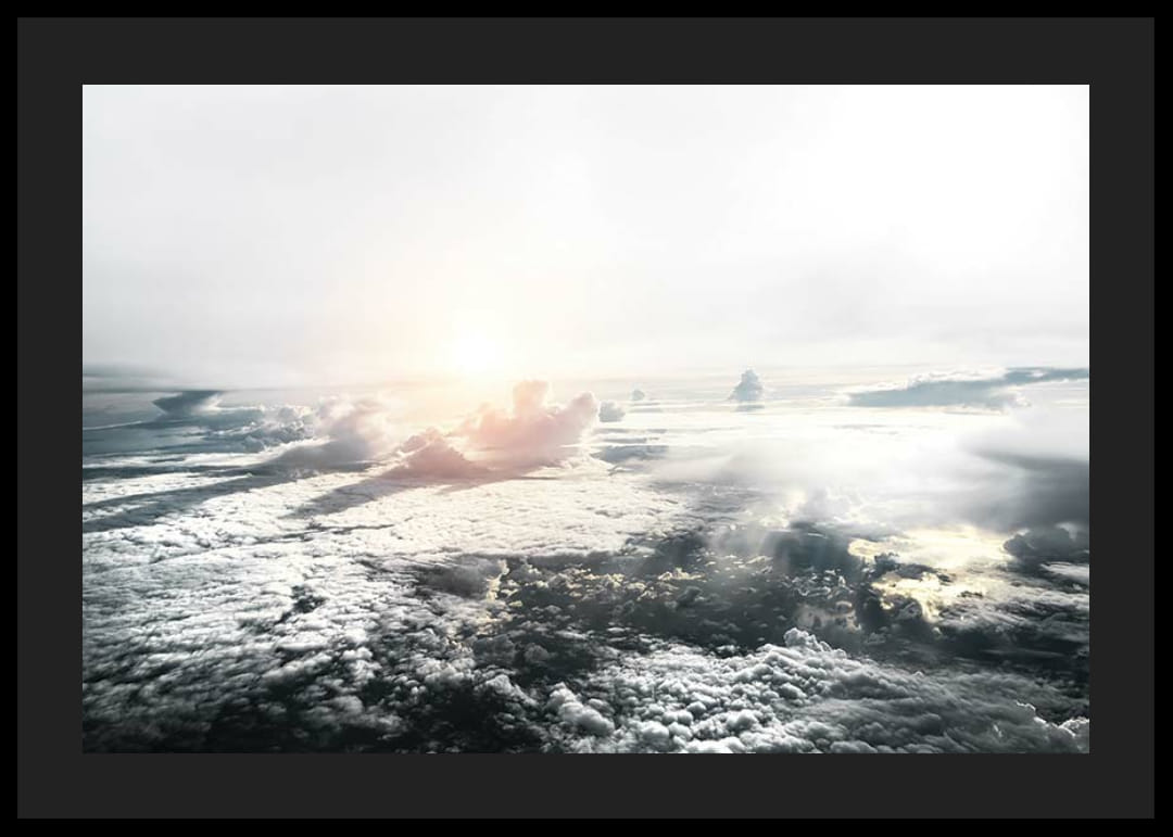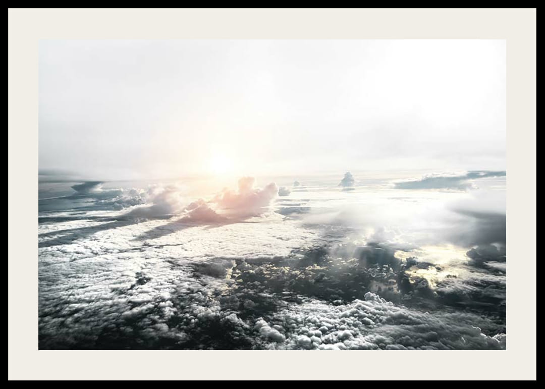 Una vista panoramica di dense nuvole con la luce del sole che filtra, creando delicati contrasti tra aree chiare e scure. La luce si diffonde sul paesaggio, dando un'impressione di ariosità e apertura. Questo poster è perfetto per gli ambienti in cui si desidera aggiungere spazio e un tocco di calma e naturalezza.