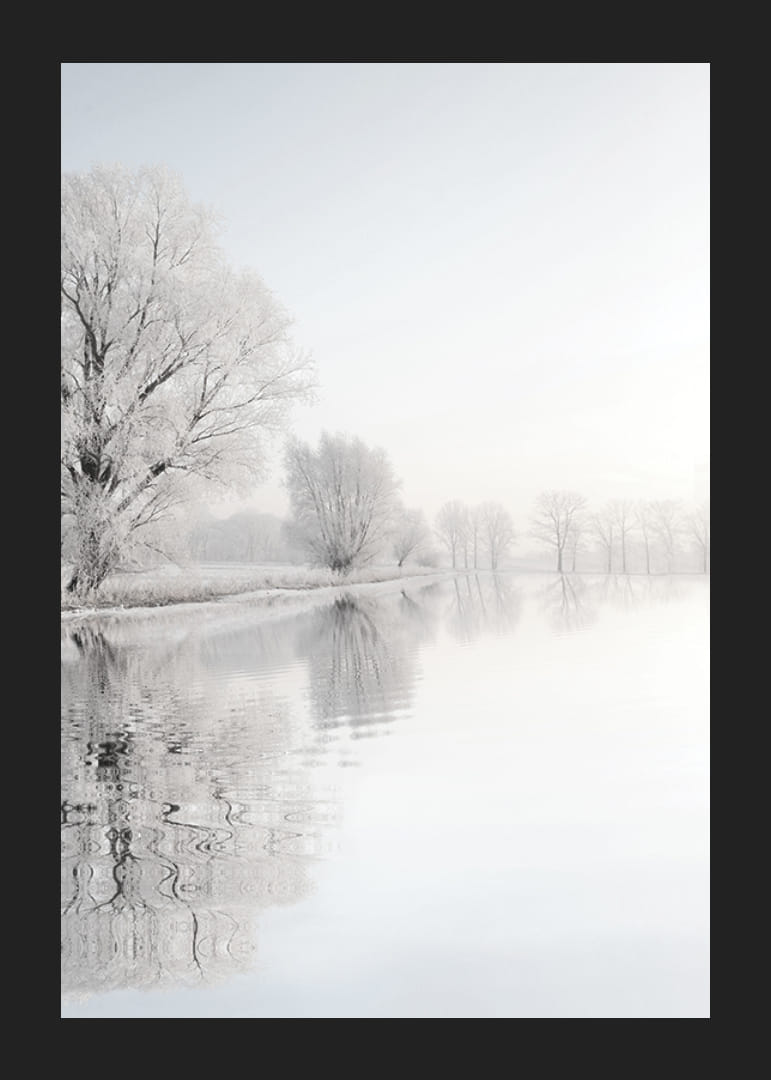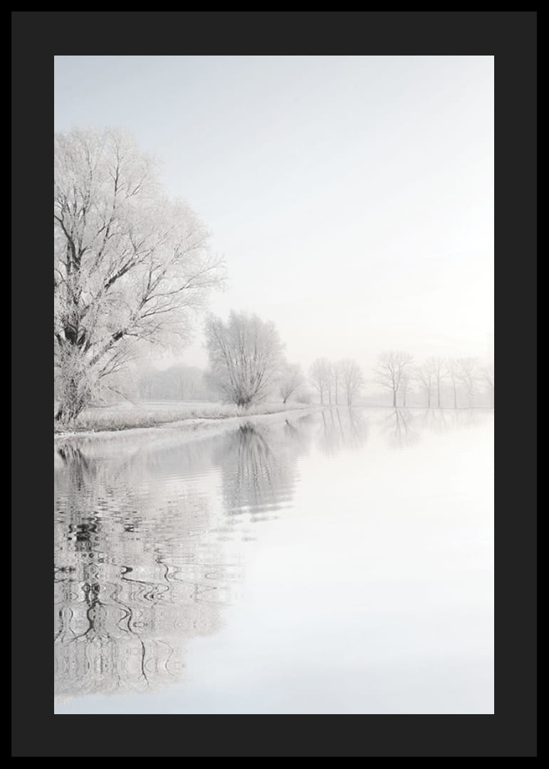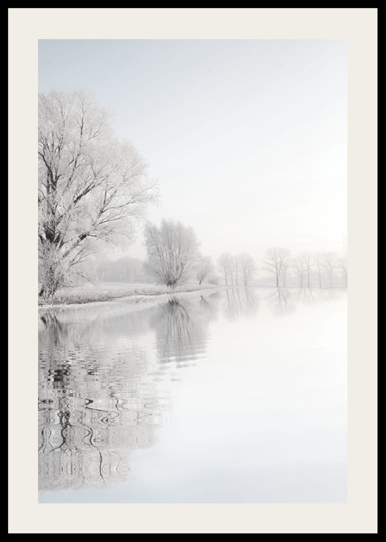 Alberi ghiacciati si stagliano lungo la riva e si riflettono nell'acqua calma, immersi nei tenui toni invernali del bianco e del grigio. Le tonalità tenui e il cielo nebbioso conferiscono alla scena un'atmosfera tranquilla. Questo poster crea un'atmosfera luminosa e ariosa ed è perfetto per gli ambienti in cui si desidera immergersi nell'atmosfera invernale della natura.