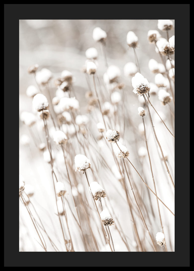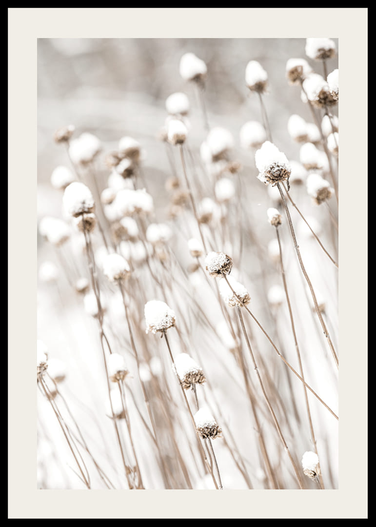 Capolini secchi con neve su ogni punta si stagliano a grappoli su uno sfondo invernale chiaro e sfocato. I sottili steli creano un motivo grafico nei toni tenui della natura. Questo poster cattura la tranquillità di un paesaggio invernale nordico e si adatta perfettamente sia al soggiorno che alla camera da letto.