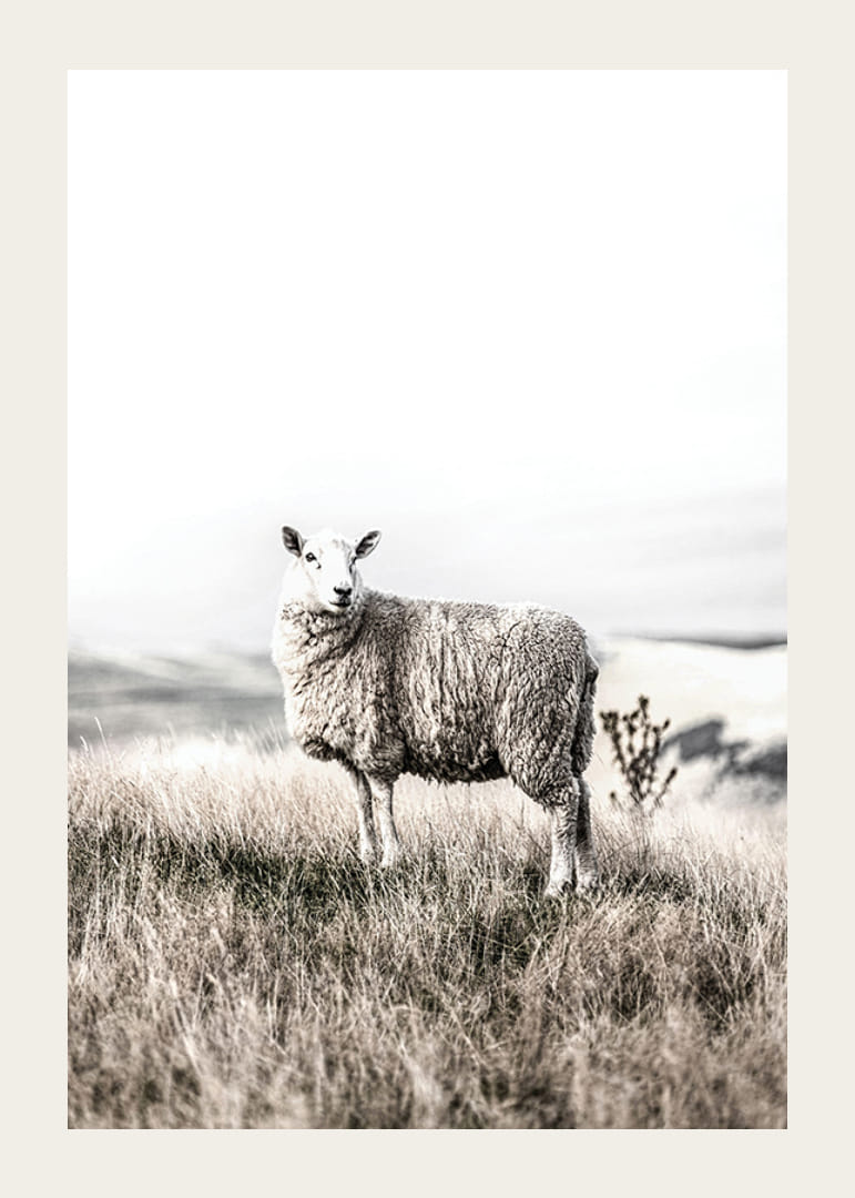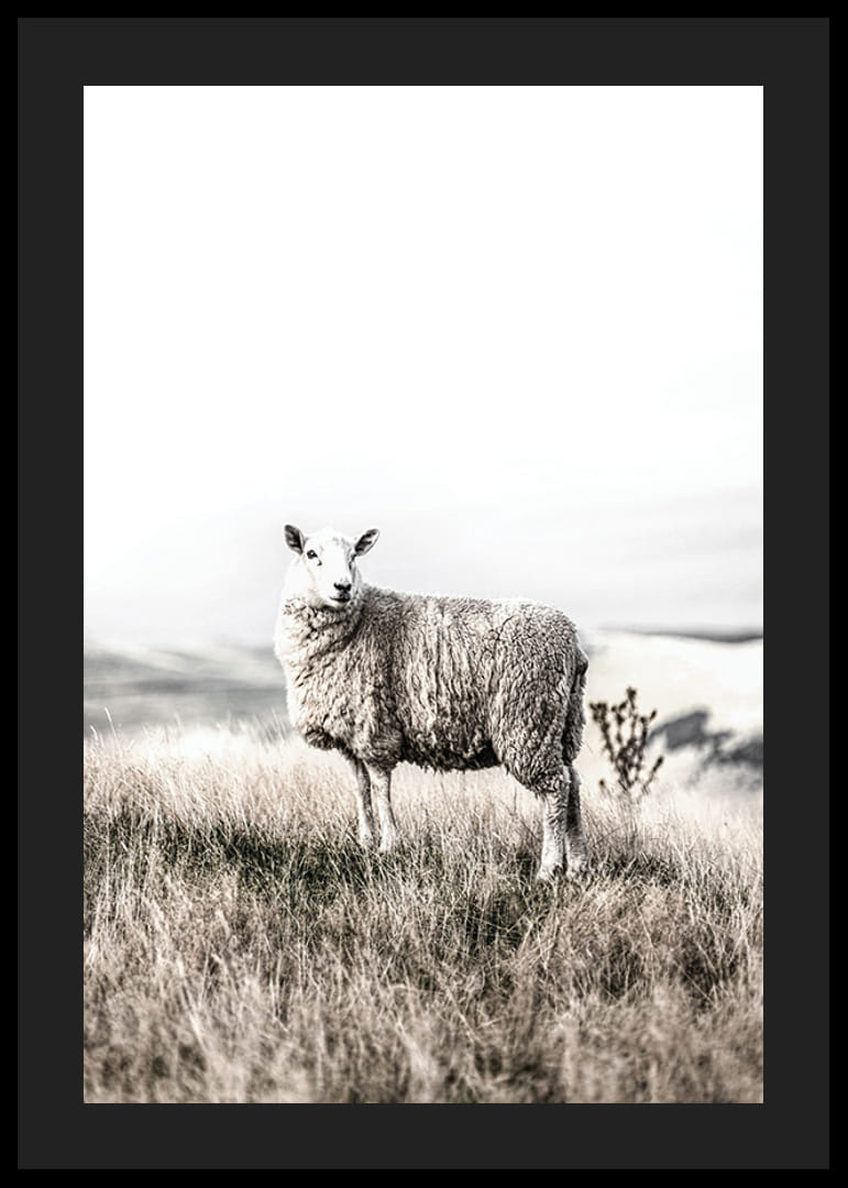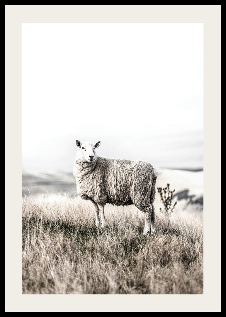Una pecora bianca solitaria si erge nell'erba alta e beige, con la vista di un vasto paesaggio sullo sfondo. La luce tenue e i colori tenui conferiscono al motivo un'atmosfera calma e sobria. Questo poster si adatta bene sia ad ambienti moderni che rurali e trasmette un senso di quiete e semplicità della natura.