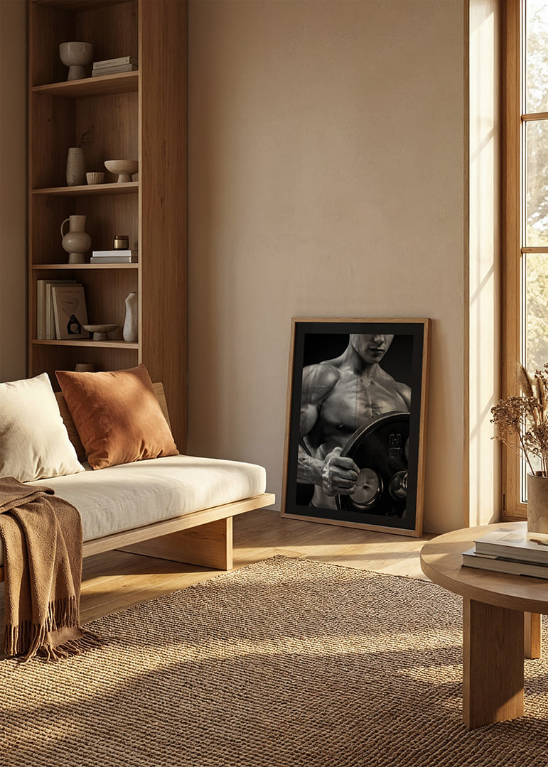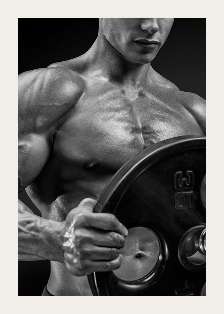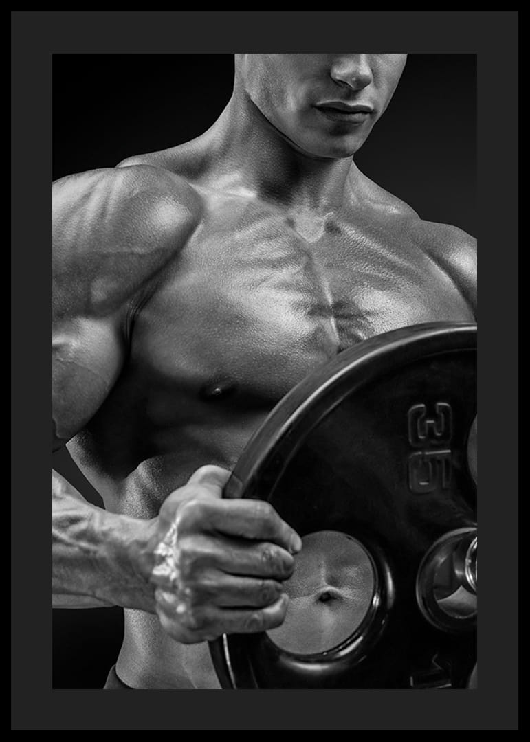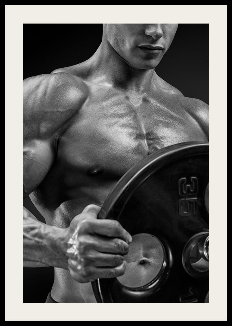 Un primo piano di un torso maschile in forma in bianco e nero, con muscoli e vene ben visibili su uno sfondo scuro. Le mani impugnano un grande disco con un gioco di luci dettagliato sulla pelle. Questo poster aggiunge un tocco forte ed energico a una palestra domestica, una sala d'allenamento o un ambiente moderno.