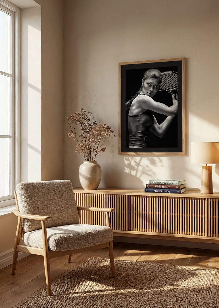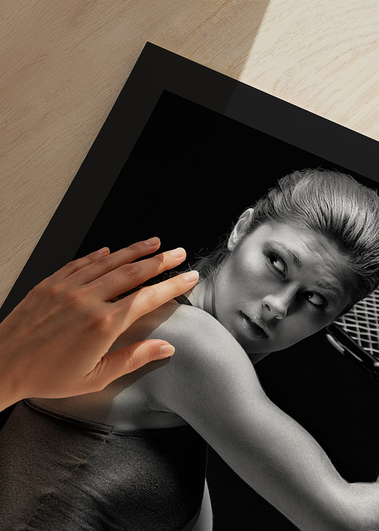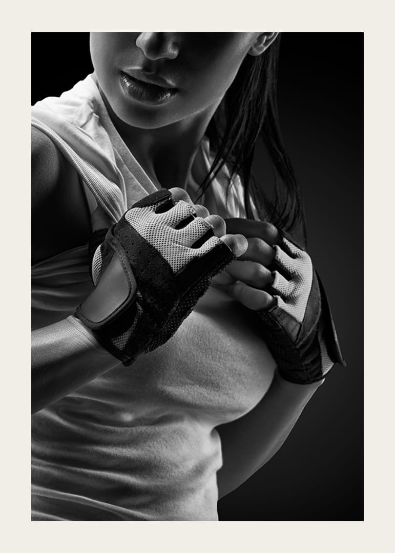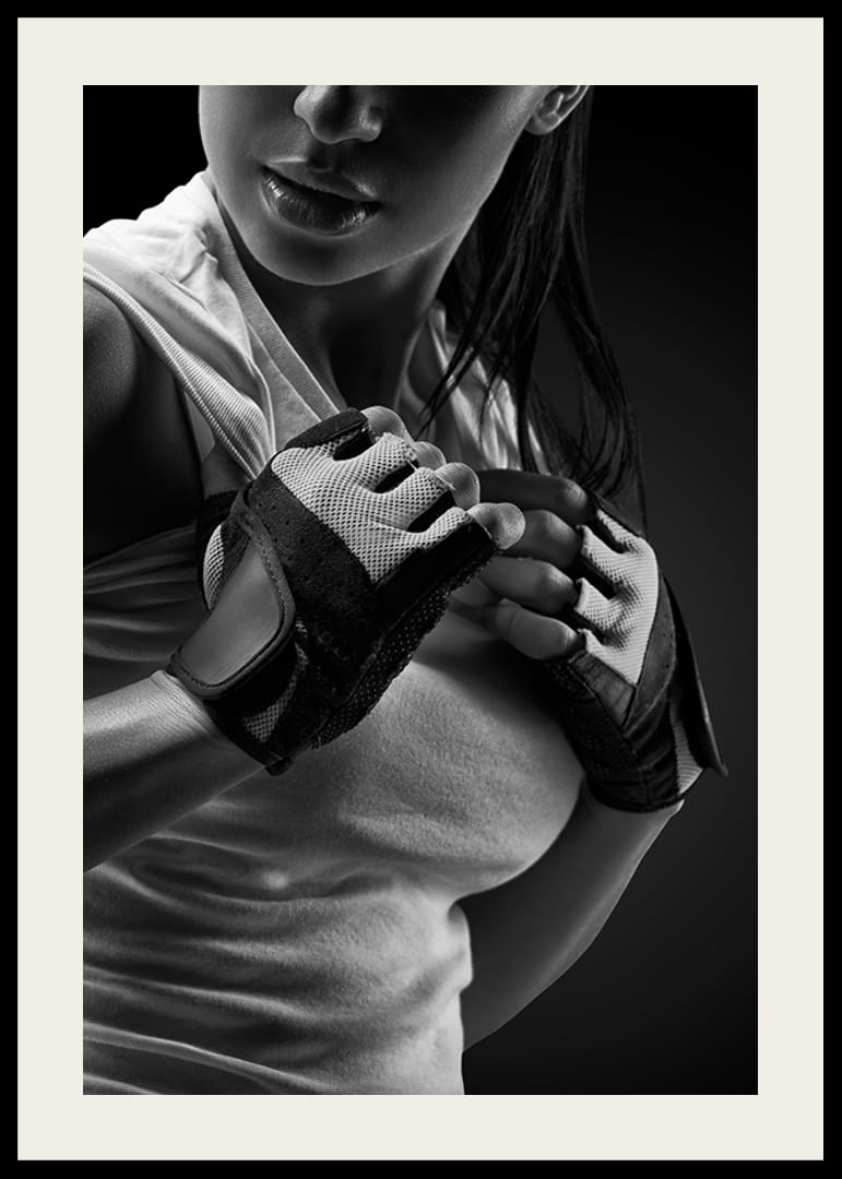 Un primo piano di una donna sportiva in bianco e nero, concentrata e con indosso guanti da allenamento. Ombre e contrasti evidenziano le linee definite e creano un forte senso di energia e determinazione. Questo poster conferisce un'espressione dinamica, adatta sia alle palestre domestiche che ai soggiorni moderni.