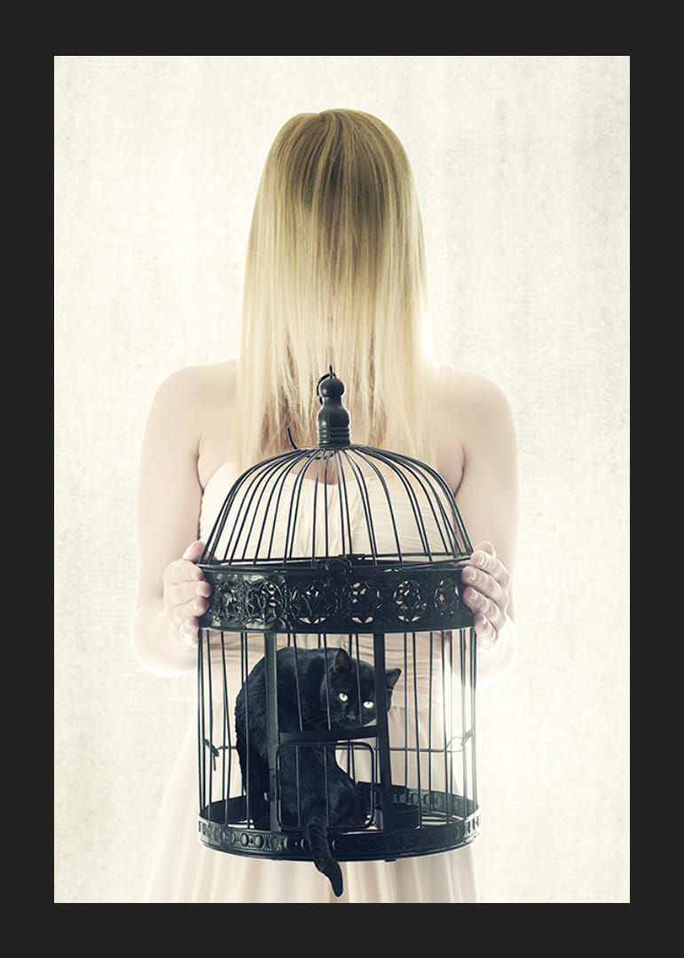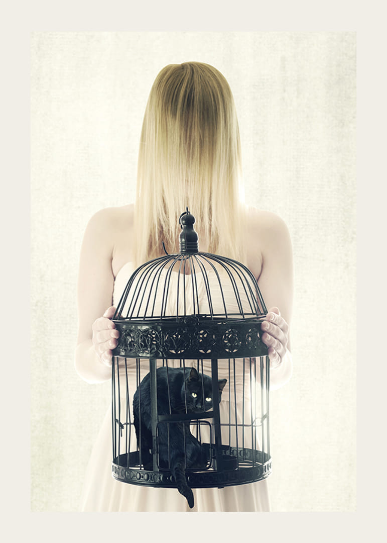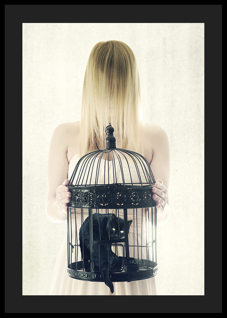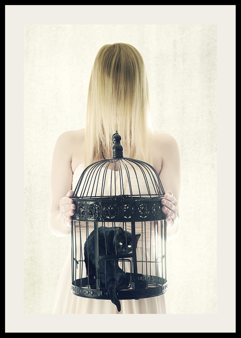 Il motivo raffigura una donna con i capelli biondi che le coprono il viso e che tiene davanti a sé una grande gabbia nera per uccelli. All'interno della gabbia siede un gatto nero con le orecchie a punta e lo sguardo fisso. Lo sfondo chiaro e la palette di colori essenziale conferiscono al poster un aspetto moderno e concettuale. Adatto ad ambienti creativi.
