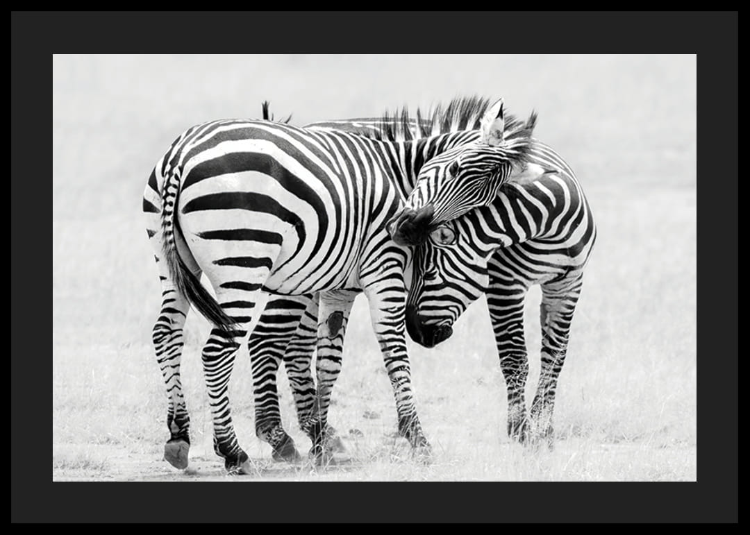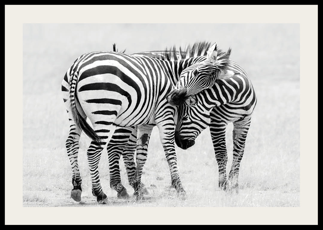 Due zebre sono vicine in una savana aperta, con le loro caratteristiche strisce che risaltano sullo sfondo luminoso e sfocato. Le zebre inclinano la testa l'una verso l'altra in un momento di pace. La combinazione di colori bianco e nero conferisce al poster un tocco di stile che si adatta bene a soggiorni o uffici moderni.