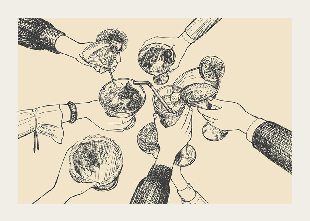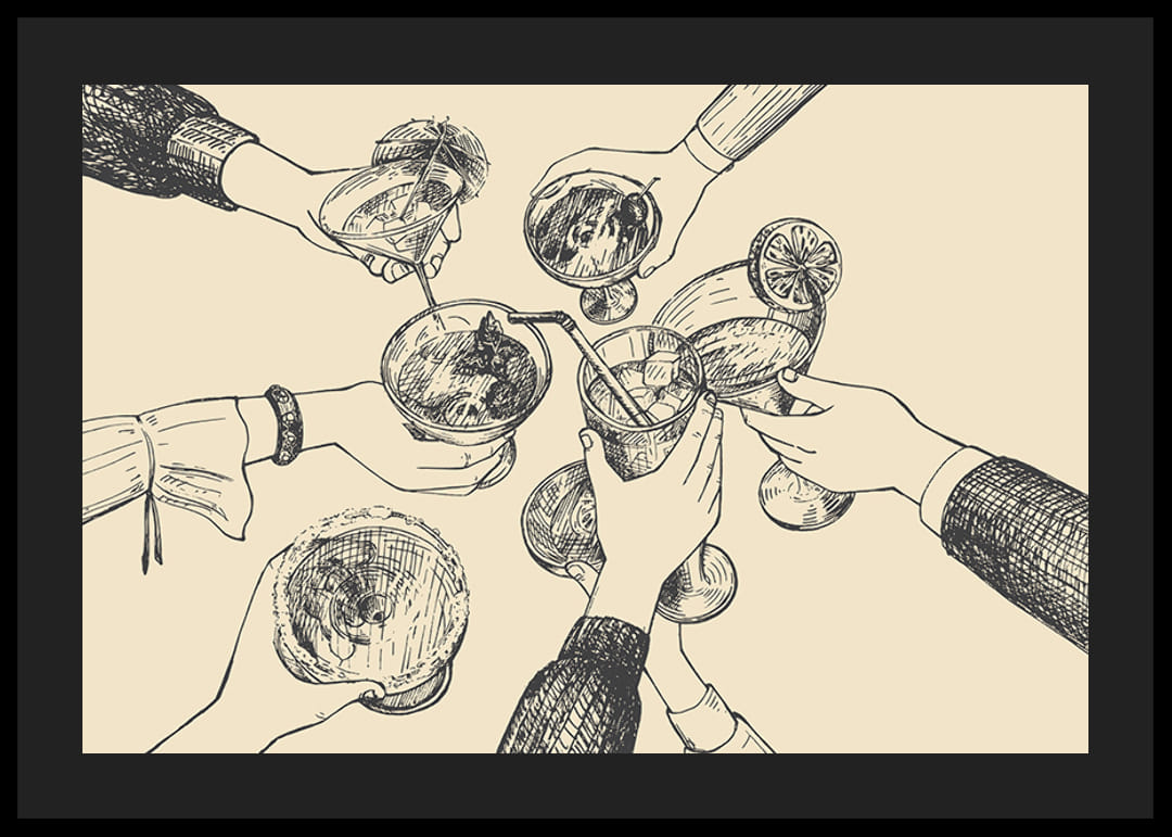 Diverse mani si protendono verso il centro e brindano a vari drink, disegnate con cura in uno stile vintage lineare su uno sfondo beige caldo. Classici bicchieri da cocktail e vari gesti delle mani catturano un'atmosfera rilassata. Questo poster sarà un'aggiunta elegante alla vostra cucina o sala da pranzo e aggiungerà un tocco di convivialità al vostro arredamento.
