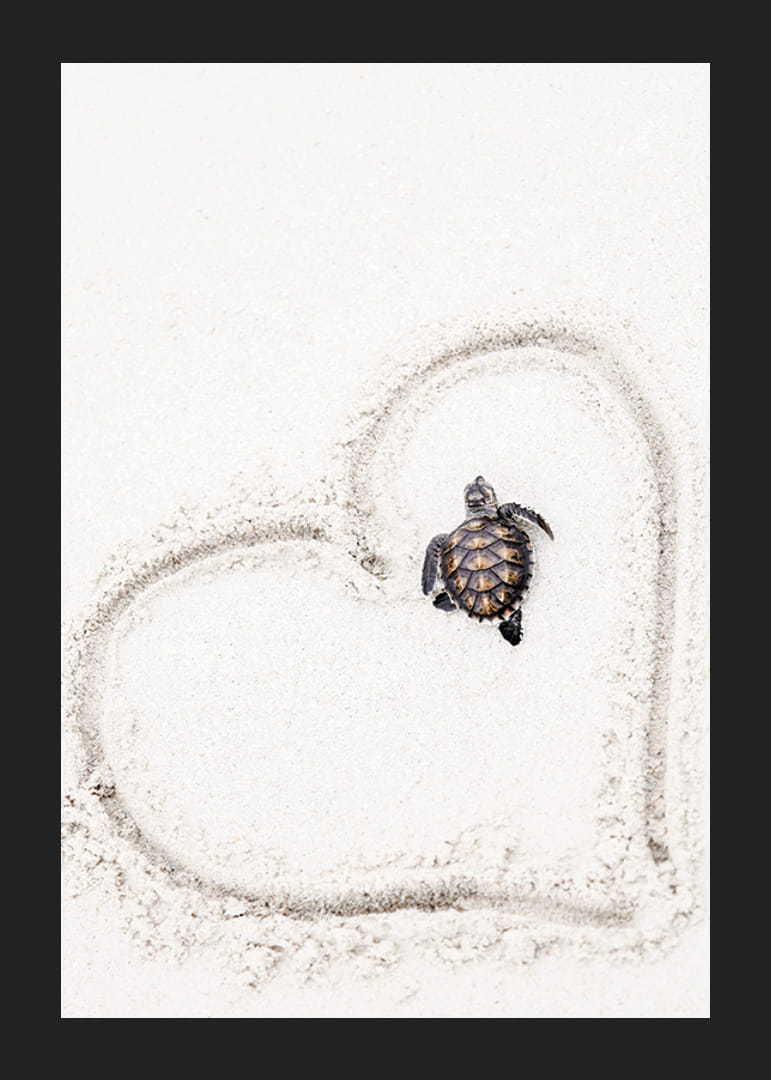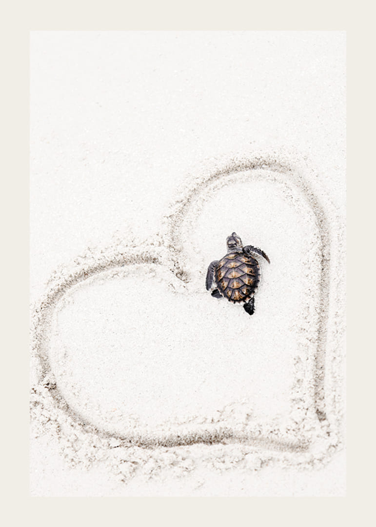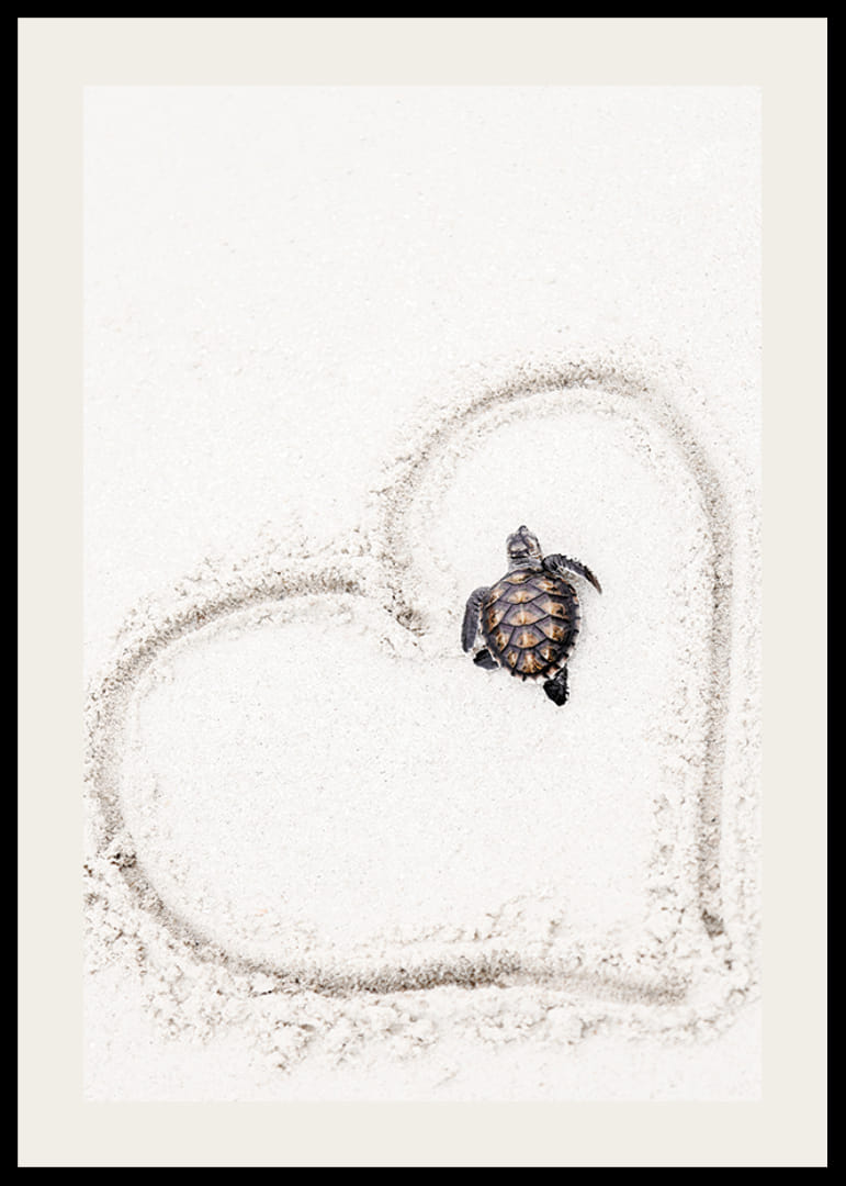 Una giovane tartaruga marina è raffigurata su una spiaggia di sabbia chiara, incorniciata da un cuore disegnato nella sabbia. Il contrasto tra la morbida superficie sabbiosa e il guscio scuro della tartaruga crea un'espressione pulita e giocosa. Questo poster aggiunge un'atmosfera spensierata e accogliente alla cameretta di un bambino o a qualsiasi altra stanza in cui siano apprezzati i motivi animali.