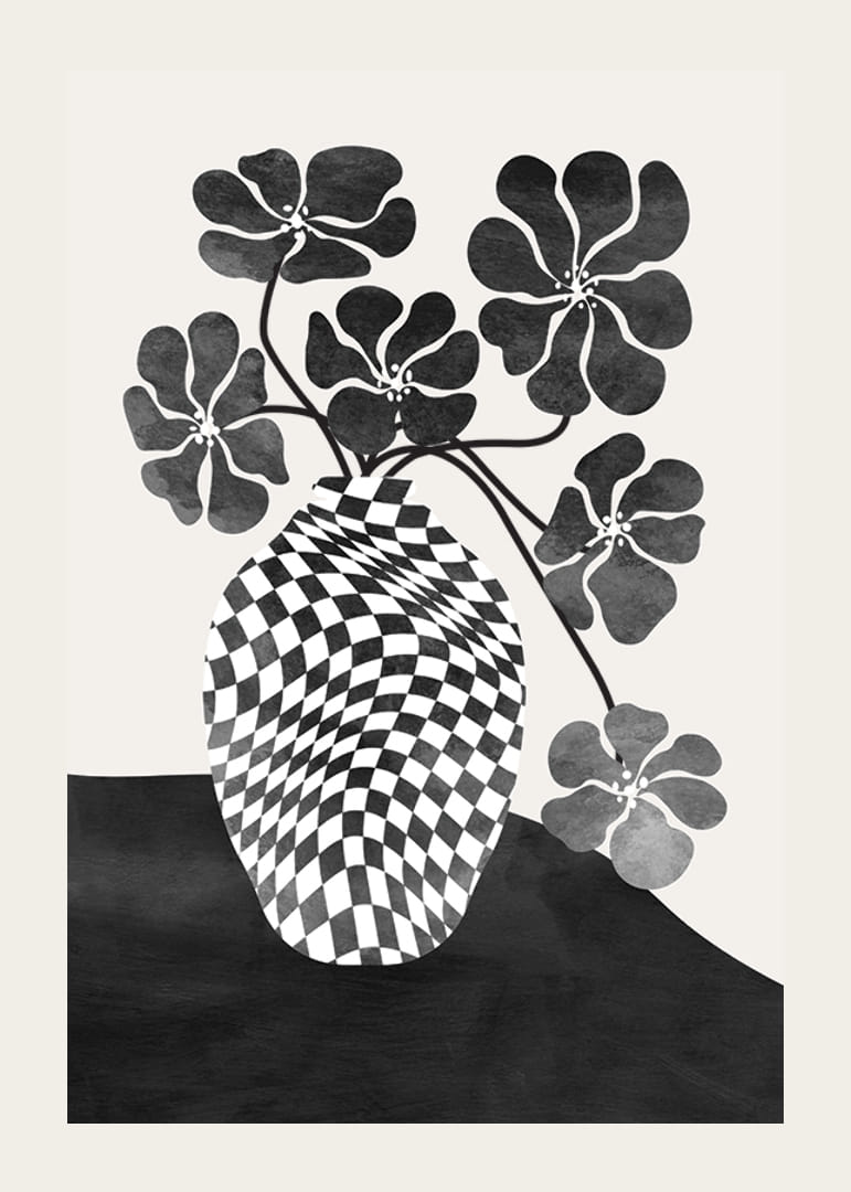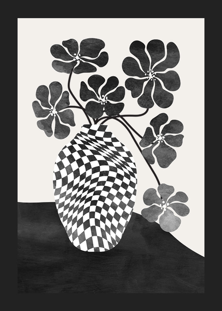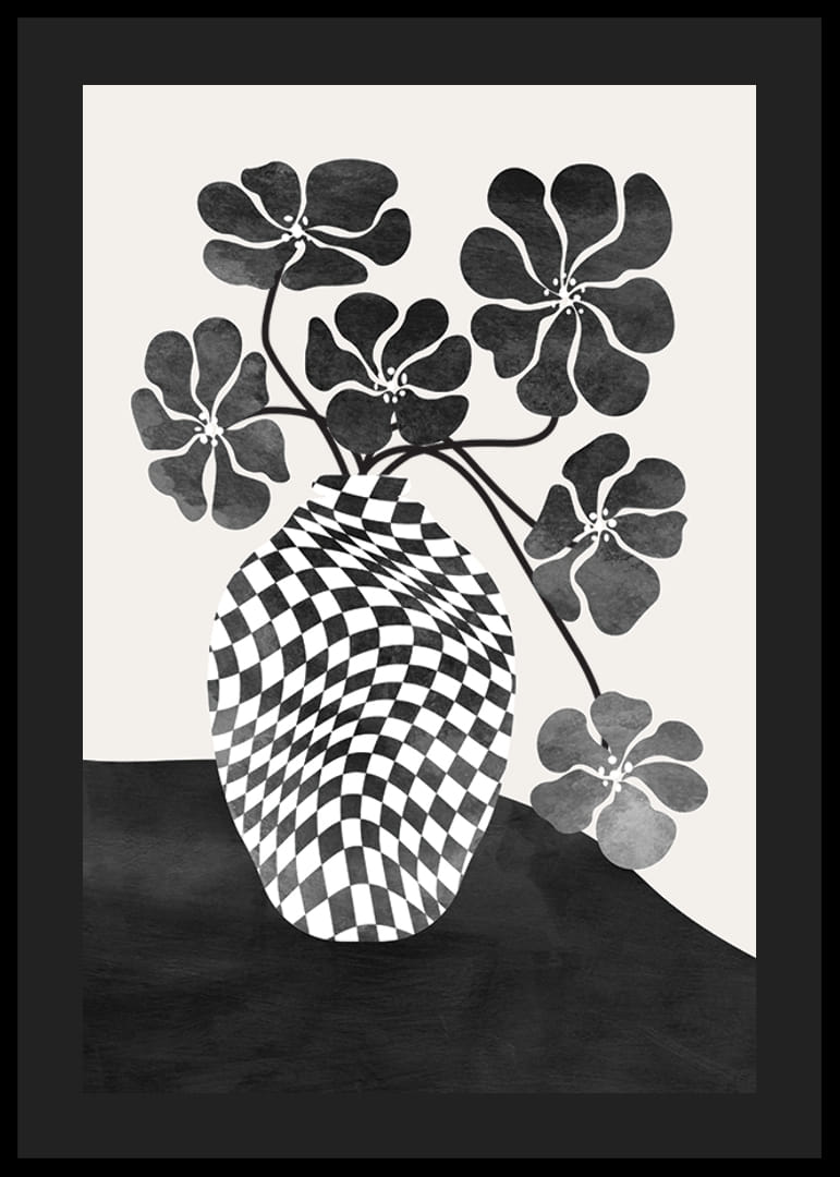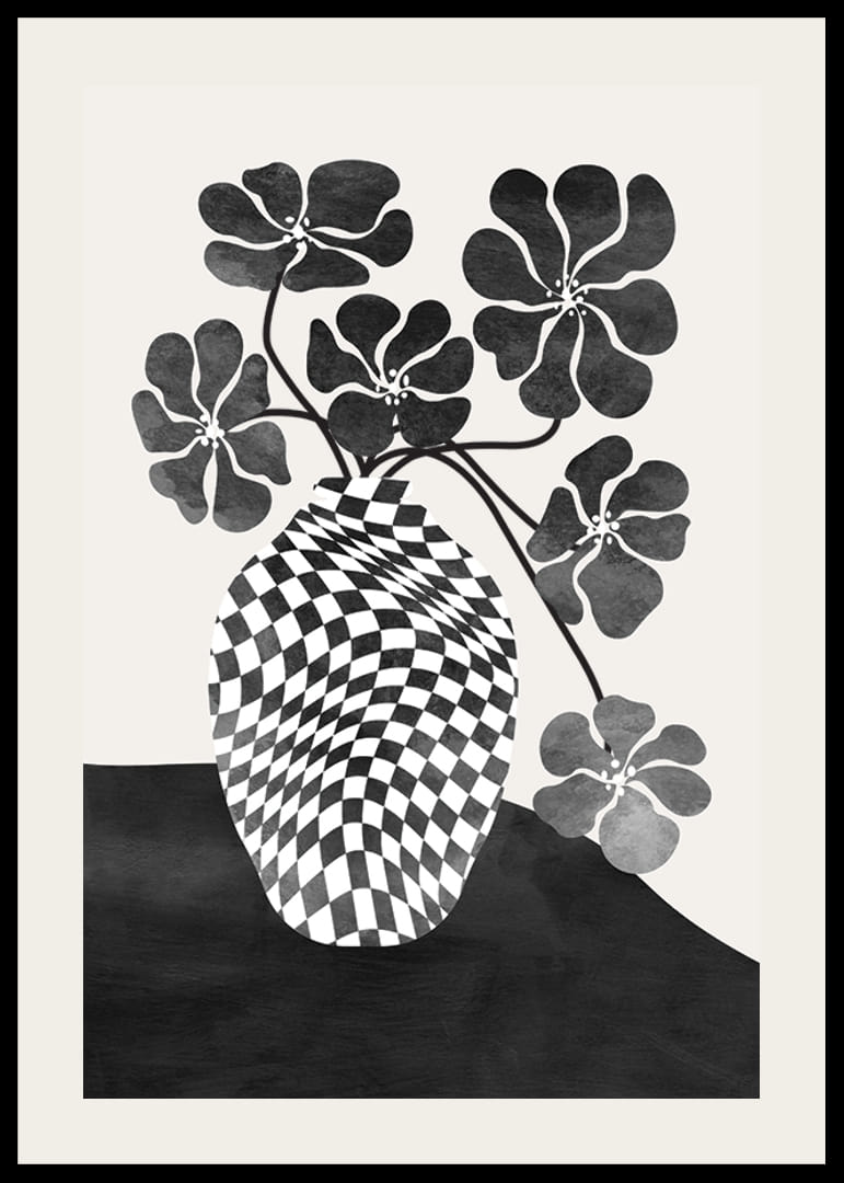 Un motivo a vaso bianco e nero decorato con un motivo a scacchi ondulato. Fiori stilizzati e lunghi steli si estendono dal vaso, creando una silhouette grafica su uno sfondo chiaro. Questo poster combina un design di ispirazione retrò con motivi botanici ed è adatto ad ambienti moderni come corridoi o studi.