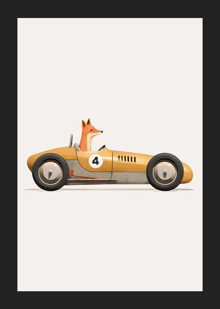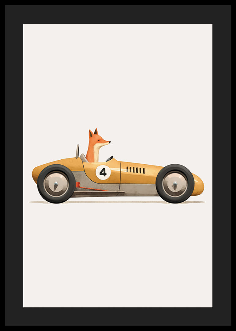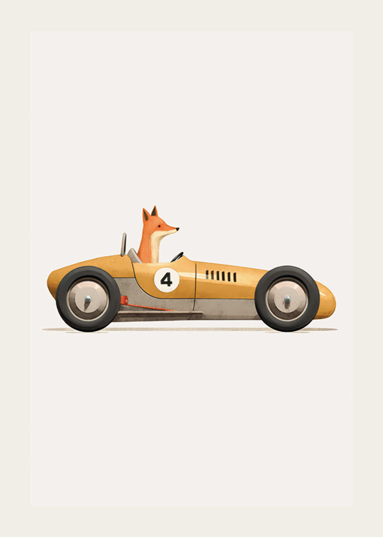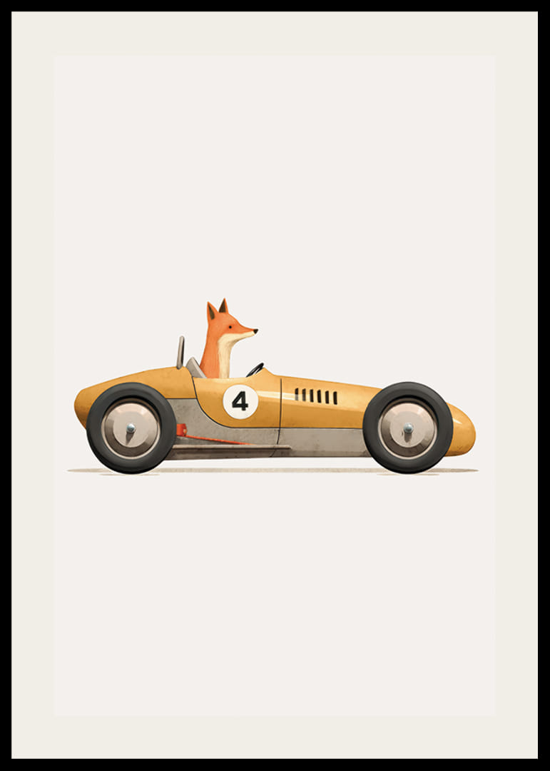 Il motivo raffigura una volpe stilizzata seduta al volante di una macchinina gialla d'ispirazione vintage con il numero quattro sul lato. Linee semplici e colori tenui conferiscono un tocco giocoso e moderno. Questo poster si adatta bene alle camerette dei bambini e crea un'atmosfera fantasiosa con temi sia animali che automobilistici.
