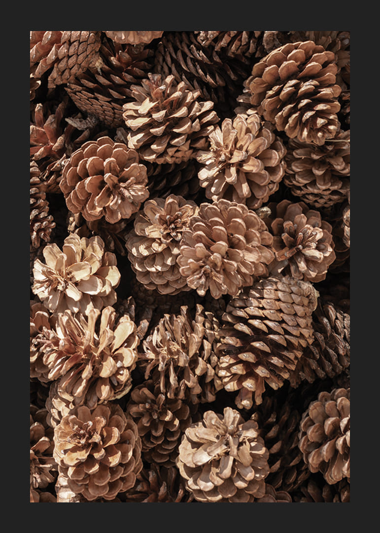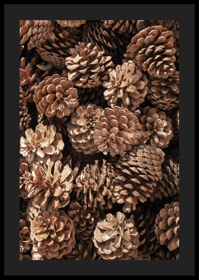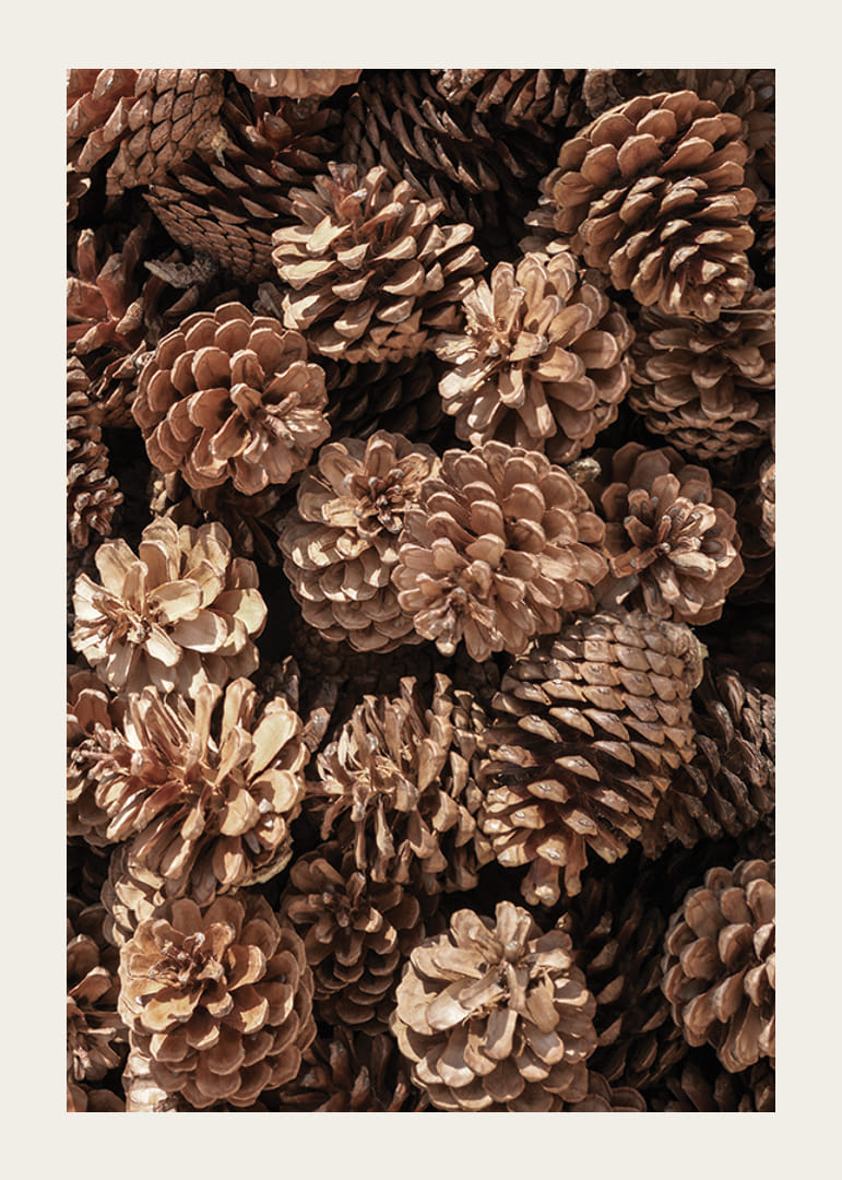 Primo piano di pigne di varie forme e tonalità di marrone. I dettagli delle montagne sono chiaramente visibili e la luce soffusa ne esalta la struttura. Un poster fotografico che trasmette un'impressione naturale e si adatta particolarmente bene alle decorazioni invernali e natalizie, o ovunque si desideri un'atmosfera naturale in casa.