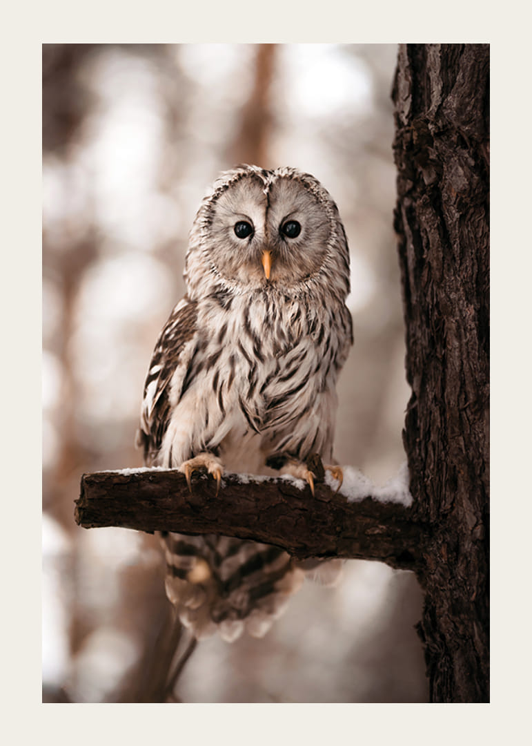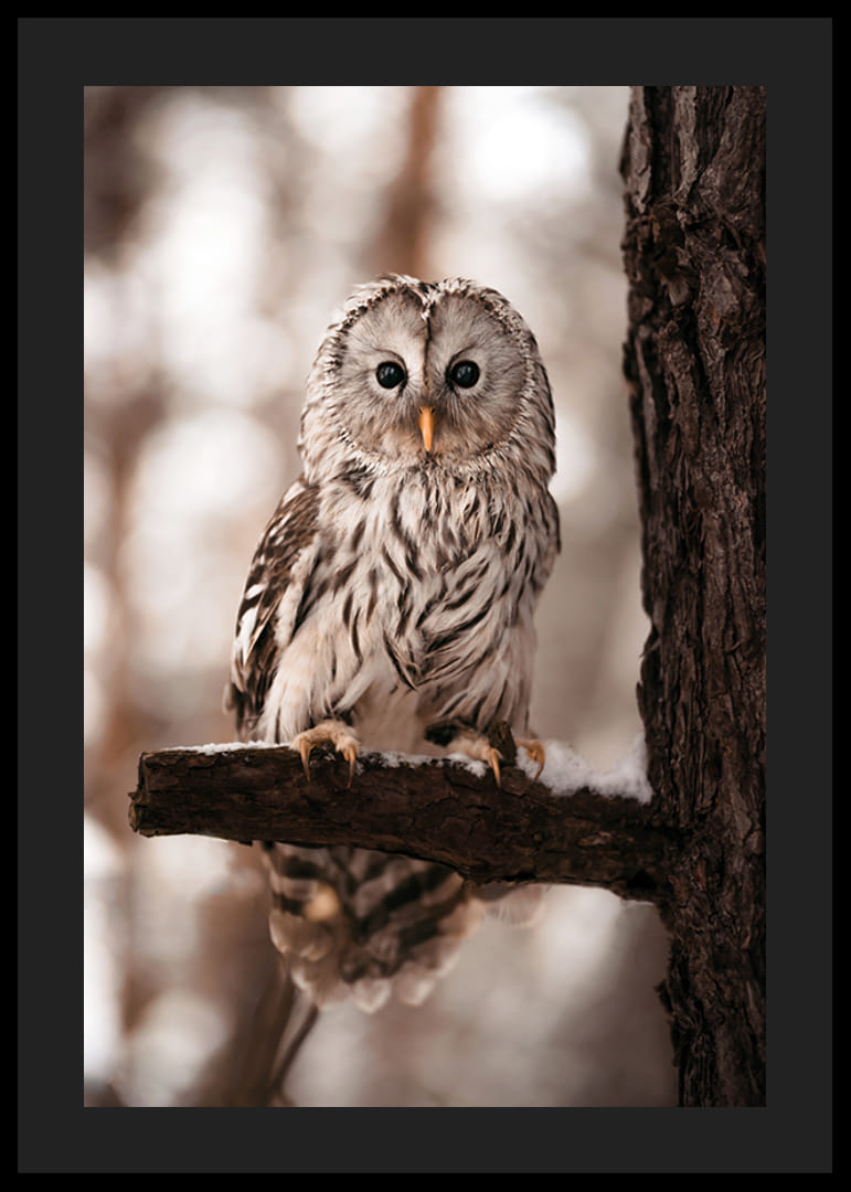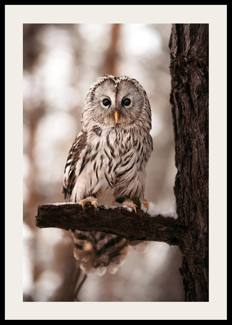 Un gufo con morbide piume grigio chiaro e marrone è seduto tranquillamente su un ramo innevato accanto al tronco di un albero. Lo sfondo è sfocato e crea un'impressione più delicata con toni tenui del marrone e del bianco. Il tocco naturalistico dettagliato rende il poster adatto sia al soggiorno che allo studio o al corridoio.