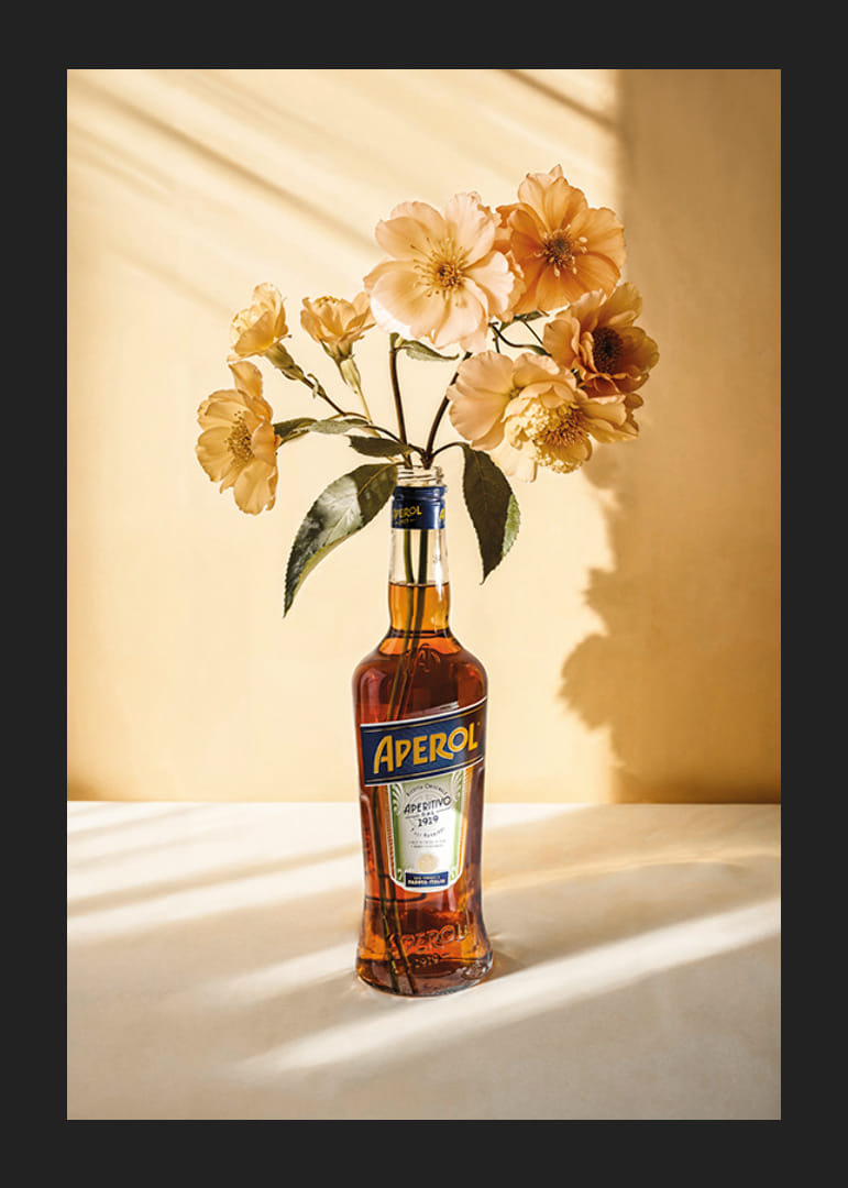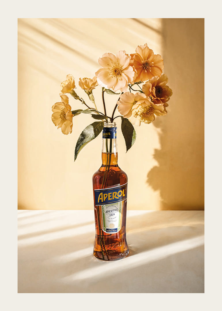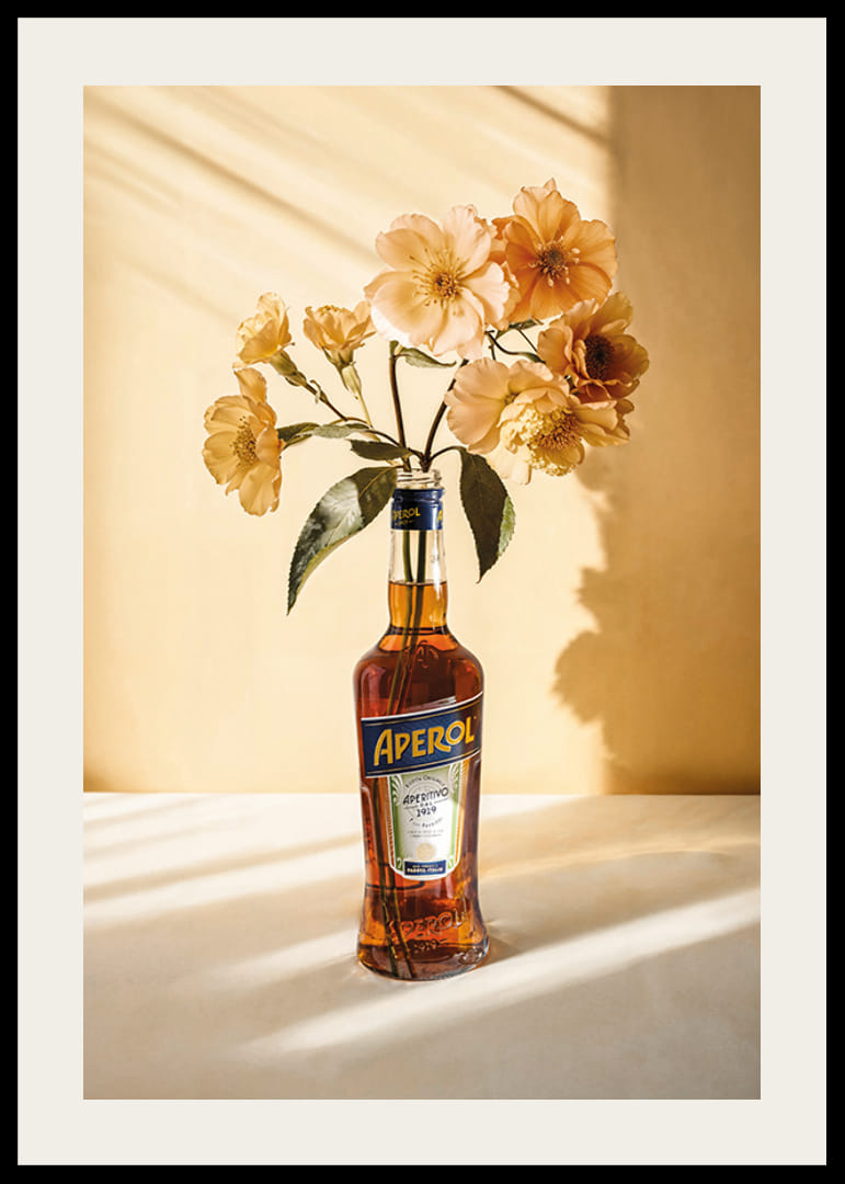 Una bottiglia di Aperol è utilizzata come vaso per fiori gialli brillanti, posizionata su un tavolo illuminato da una luce soffusa e da uno sfondo beige caldo. Le ombre dei fiori e della bottiglia creano un'espressione vivida. Questo poster si adatta perfettamente sia alla cucina che alla sala da pranzo, conferendo un tocco moderno con una delicata ispirazione botanica.