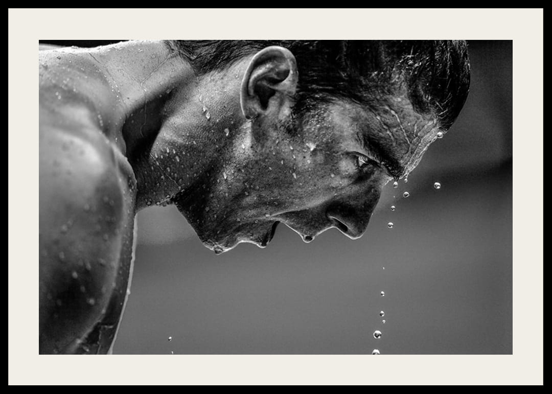 Poster in bianco e nero con una fotografia di Michael Phelps, Stati Uniti. L'acqua gocciola da Michael Phelps degli Stati Uniti dopo aver gareggiato nelle semifinali dei 100 metri farfalla l'11 agosto 2016 durante le Olimpiadi di Rio de Janeiro.