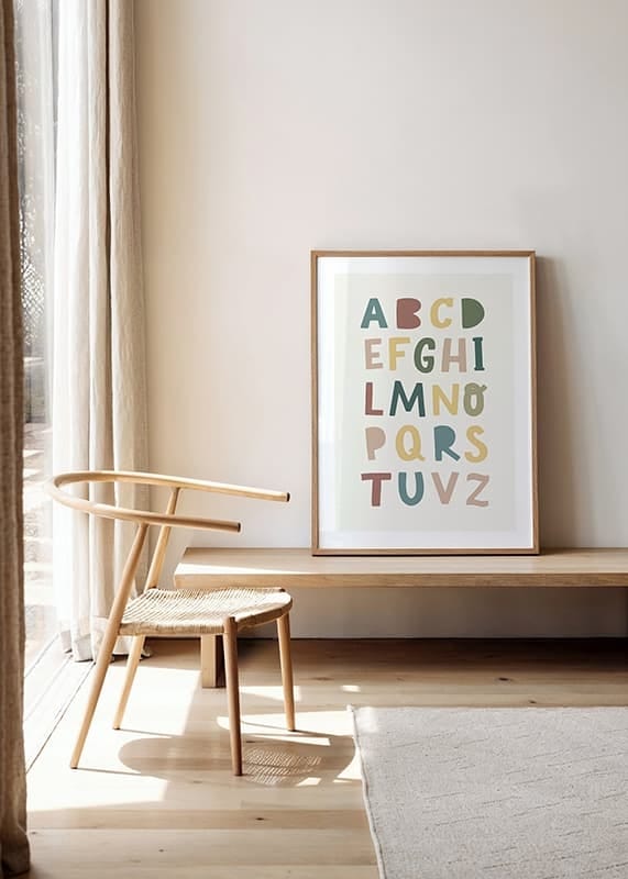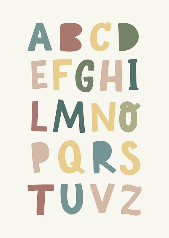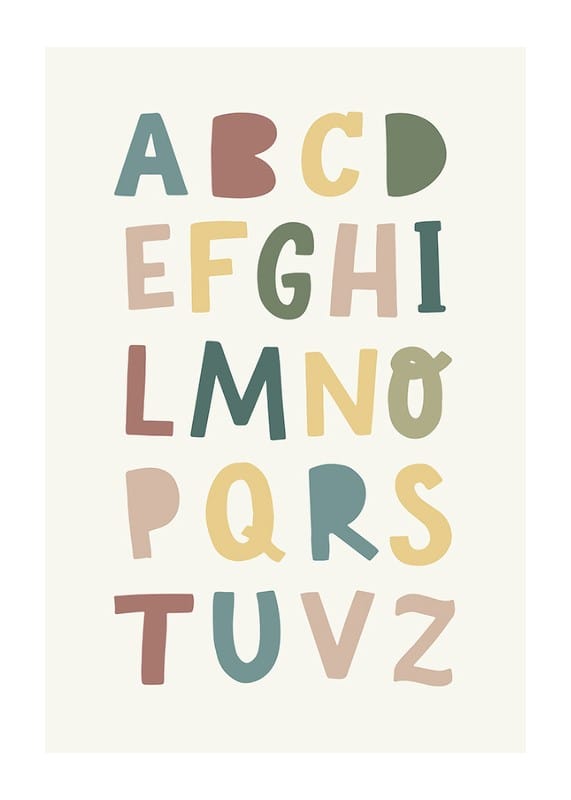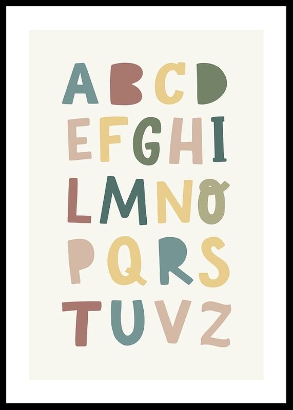 Trasforma la stanza dei bambini con questo poster colorato ed educativo. Il design giocoso con l'alfabeto in tonalità tenui e tenui rende l'apprendimento divertente e visivamente accattivante. Perfetto per ispirare curiosità e creatività nel tuo bambino ogni giorno.