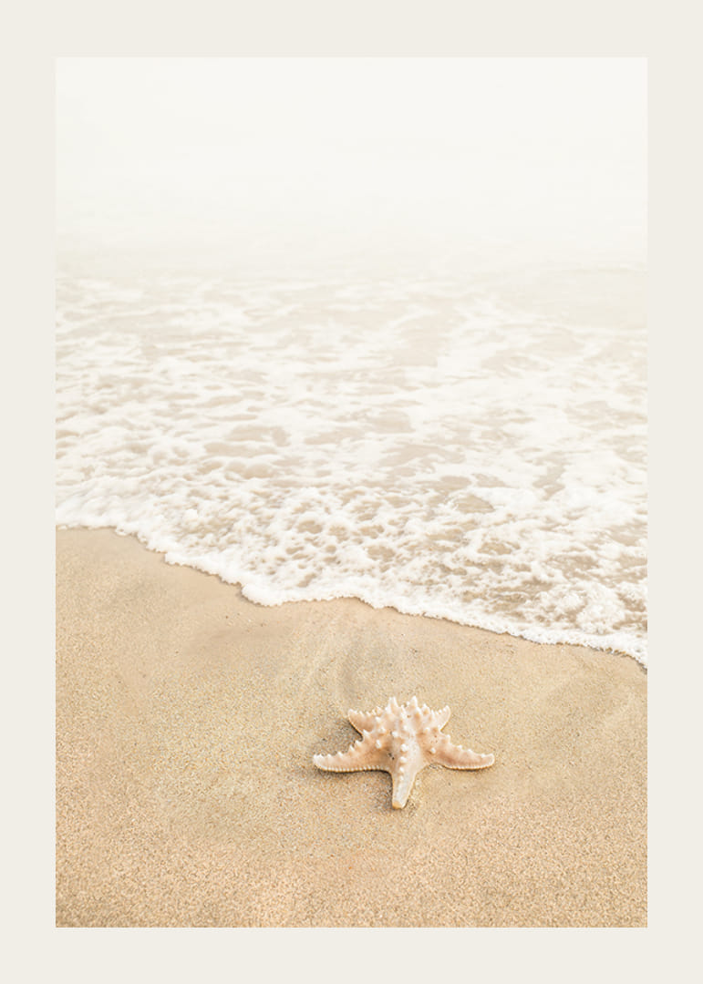 Cattura la tranquilla bellezza della vita costiera con questo poster armonioso. Una stella marina solitaria giace sulla soffice spiaggia di sabbia, circondata da onde dolcemente ondulate. Perfetto per creare un'atmosfera tranquilla e rilassante nella vostra casa.