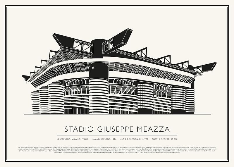 Lo Stadio Giuseppe Meazza, noto anche come San Siro, è un'iconica stadio di calcio situato a Milano, Italia. Inaugurato nel 1926, ha una capacità di oltre 80.000 posti a sedere, rendendolo uno dei più grandi stadi in Europa. Lo stadio è la casa di entrambe le squadre di calcio Inter Milan e AC Milan, due dei club più prestigiosi d'Italia. Conosciuto per il suo design distintivo, che include le sue torri con rampe a spirale, San Siro offre un'atmosfera elettrizzante durante le partite. Lo stadio ha ospitato numerosi eventi prestigiosi, tra cui partite della Coppa del Mondo FIFA, finali della UEFA Champions League e concerti di artisti di fama mondiale. Con la sua ricca storia e strutture moderne, lo Stadio Giuseppe Meazza è un simbolo del patrimonio calcistico di Milano e un importante centro per lo sport e l'intrattenimento. La sua eredità continua a essere una fonte di orgoglio per la città e un punto di riferimento nel mondo del calcio.