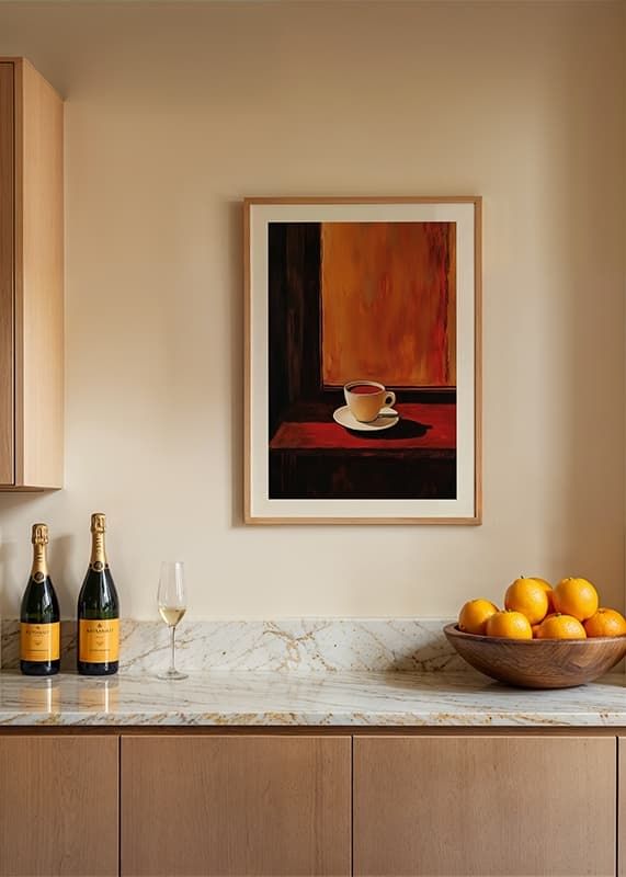 Questo poster suggestivo cattura una scena semplice ma potente: una tazza di caffè immersa in una luce calda e dorata su uno sfondo scuro. Le intense tonalità del marrone e dell'arancione creano un senso di calma e contemplazione, perfetto per conferire alla vostra casa un'atmosfera sofisticata e rilassante.