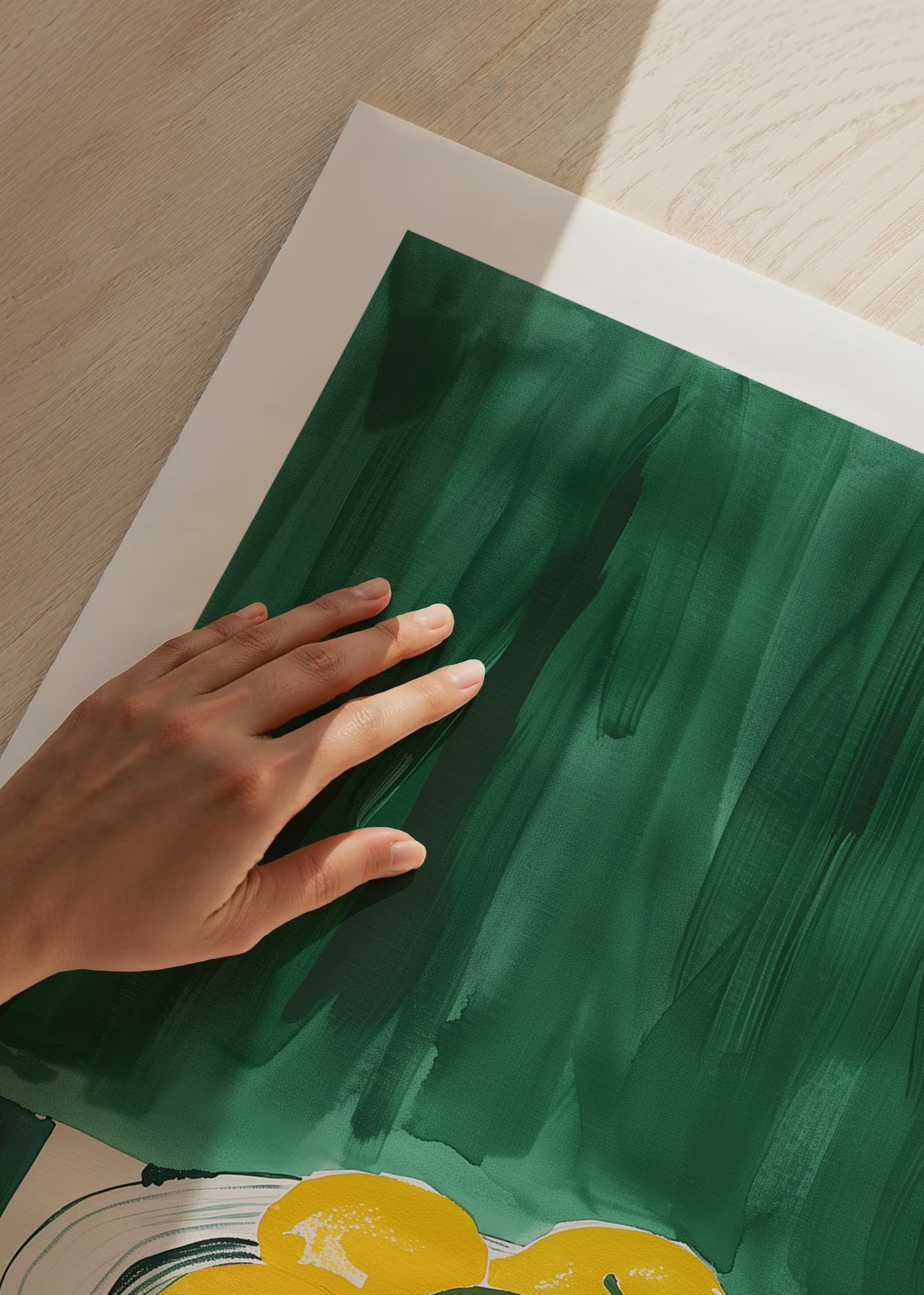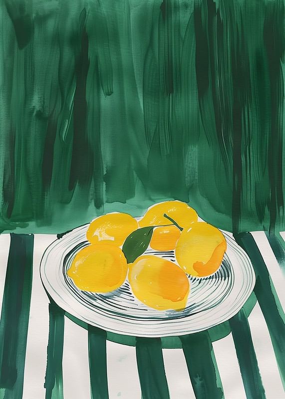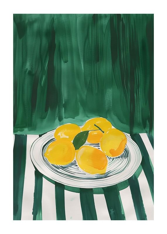 Questo fresco poster mostra una collezione di limoni gialli soleggiati, disposti su un vassoio a strisce su uno sfondo verde intenso. I forti contrasti cromatici e le morbide pennellate acquerellate creano un'atmosfera vivace ed estiva.