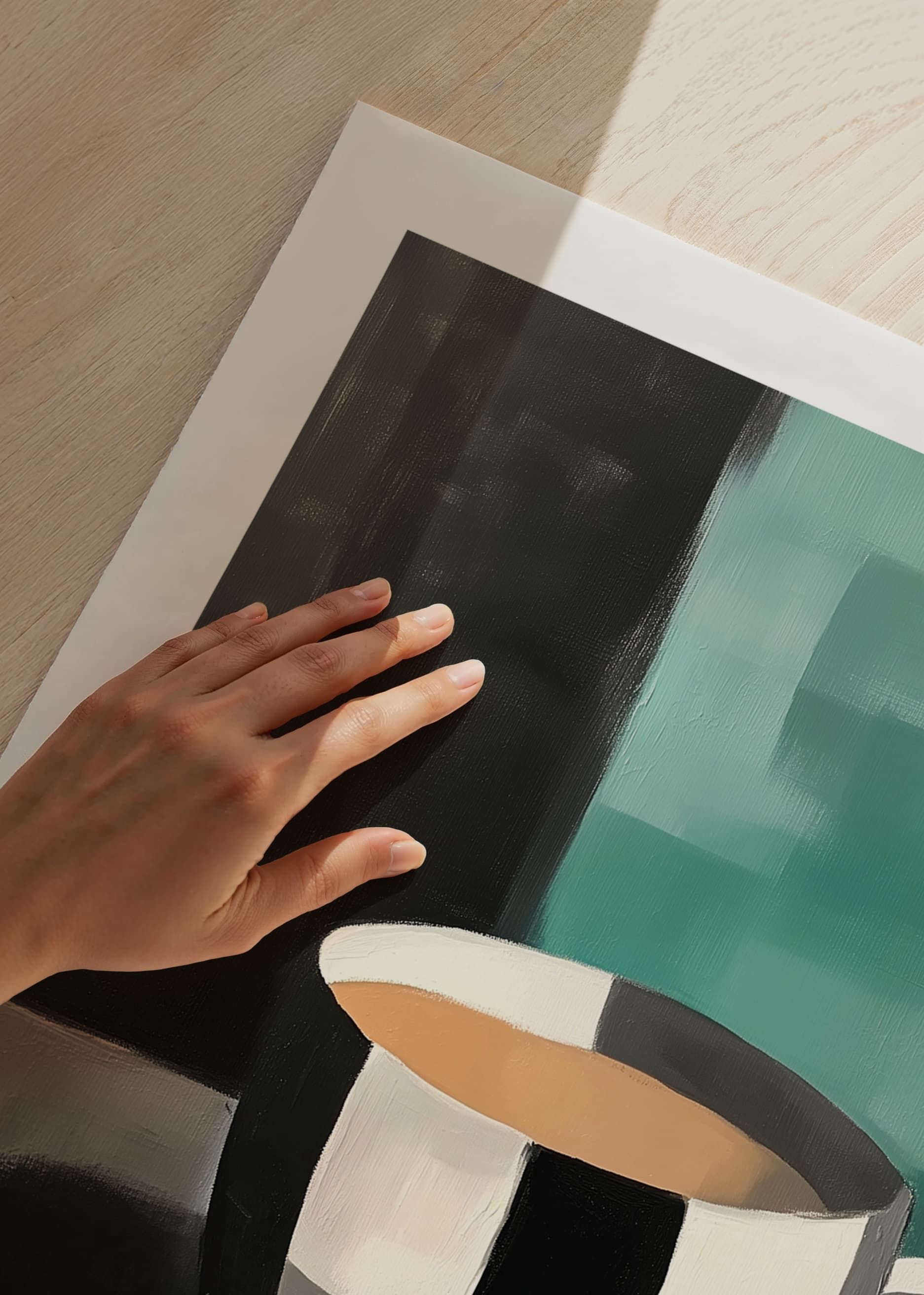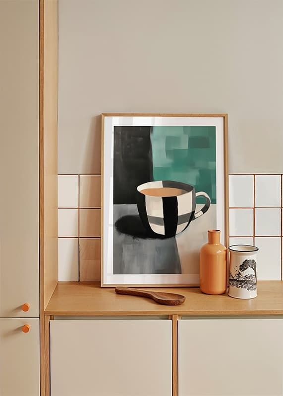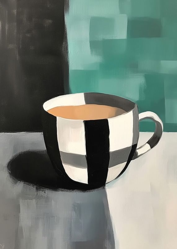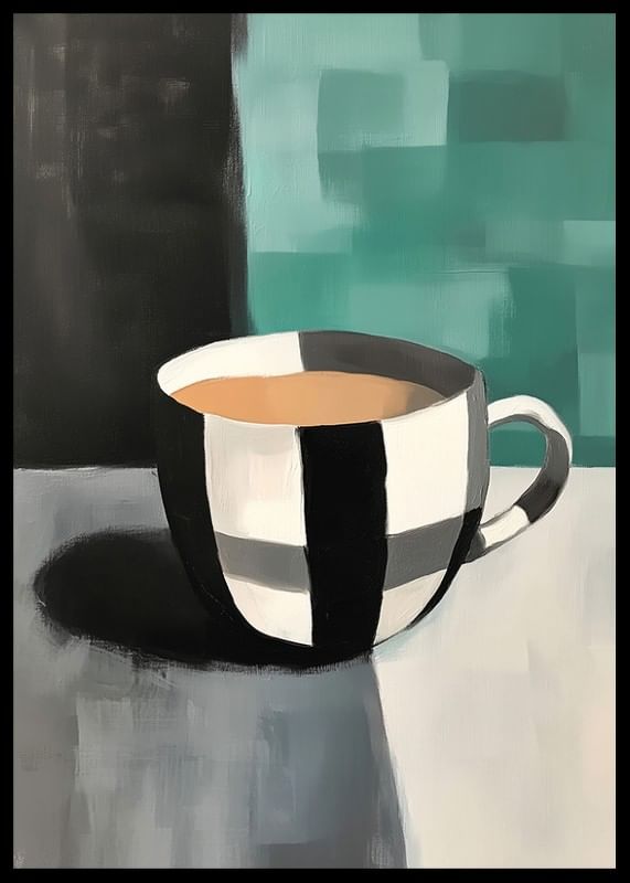 Questo poster trasmette un senso di elegante semplicità con una tazza da caffè in bianco e nero posta su uno sfondo morbido e astratto nei toni del verde e del nero. La tazza da caffè, con il suo motivo a scacchi, crea un effetto di calma e di equilibrio visivo che esalta la quotidianità in forma estetica.