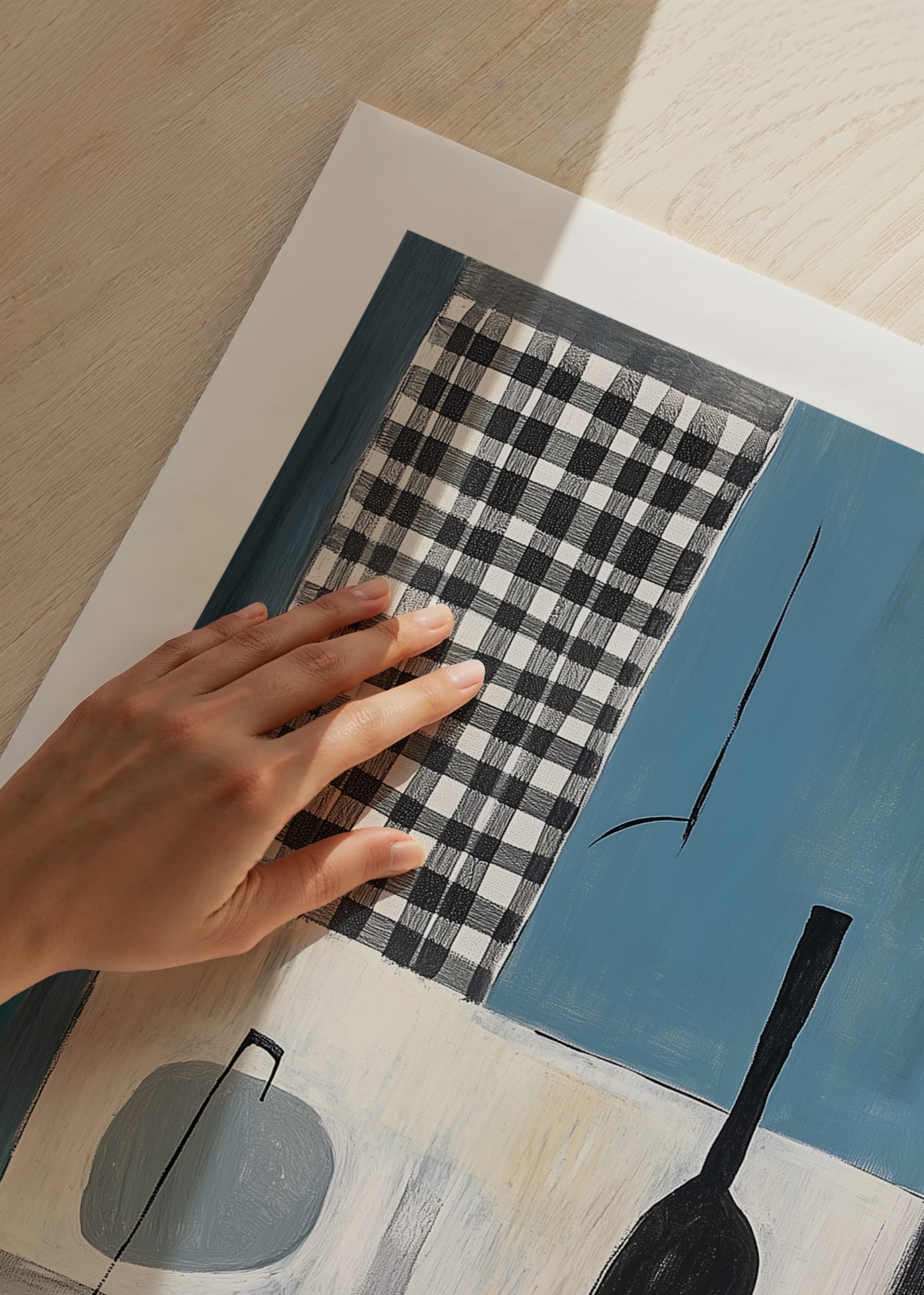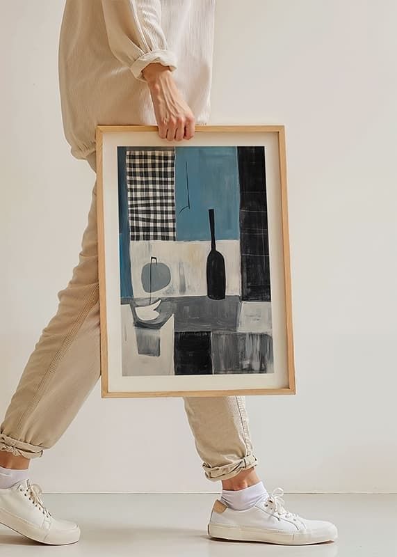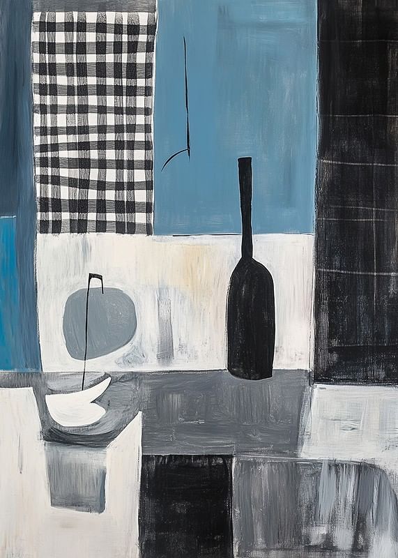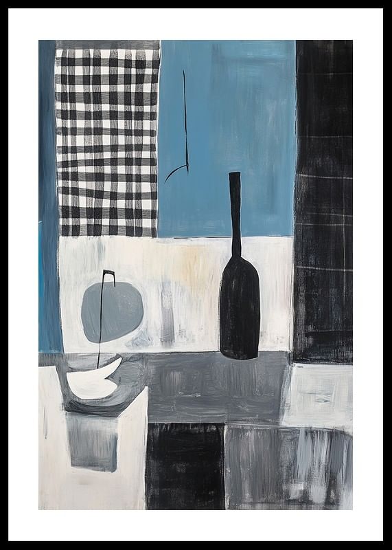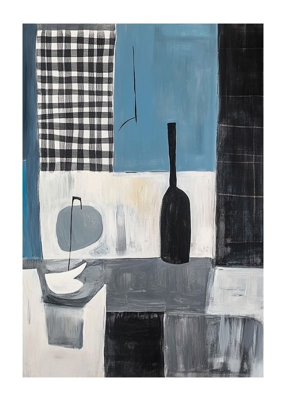 Questo poster cattura l'attenzione con le sue forme geometriche e la delicata combinazione di colori blu e nero. La disposizione astratta crea un senso di quiete e creatività, in cui ogni linea e sfumatura contribuisce a creare un insieme armonioso.