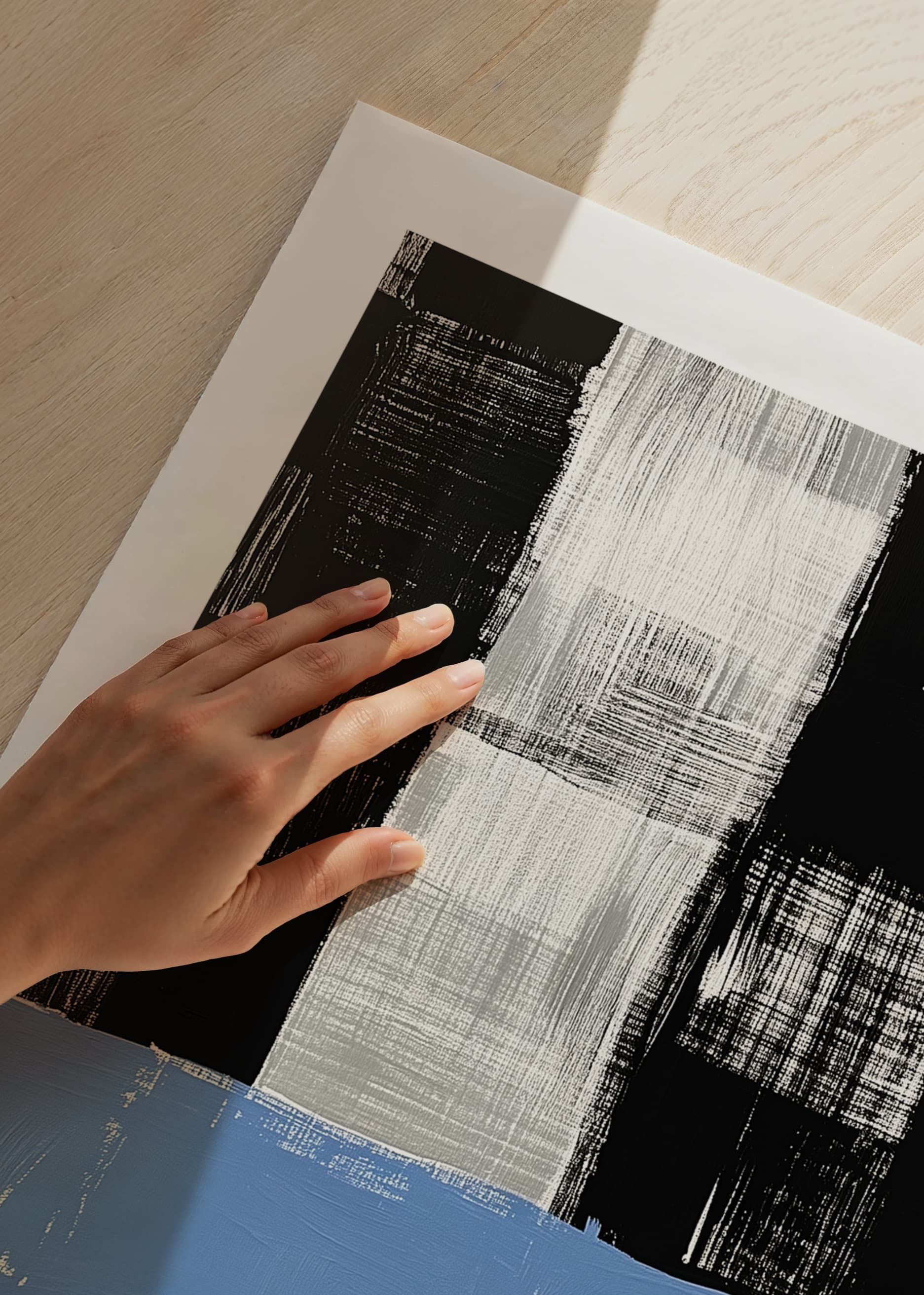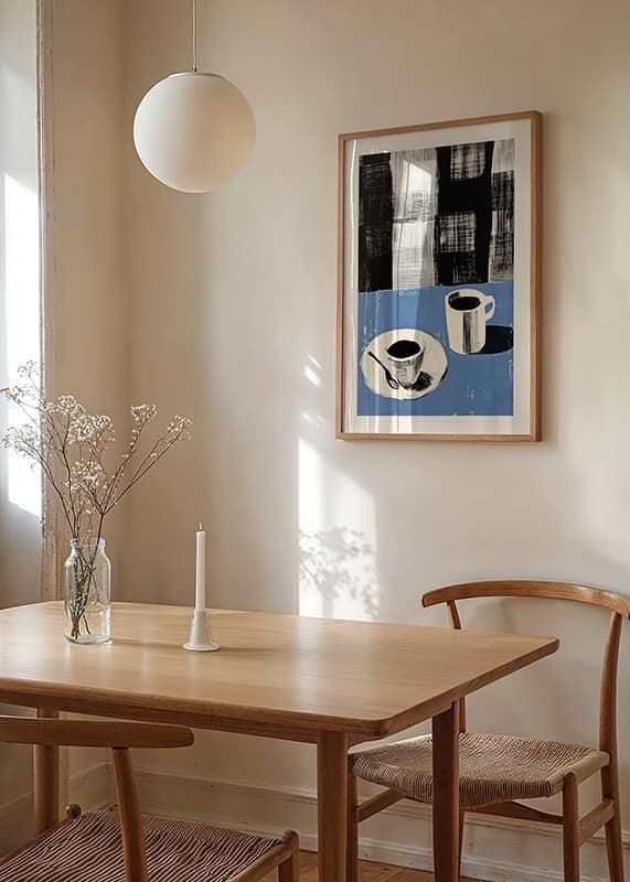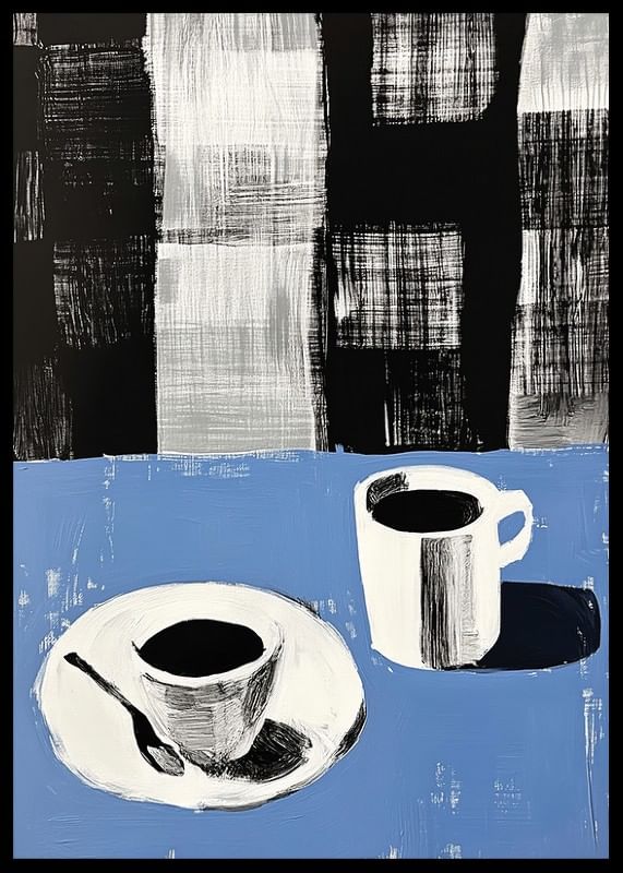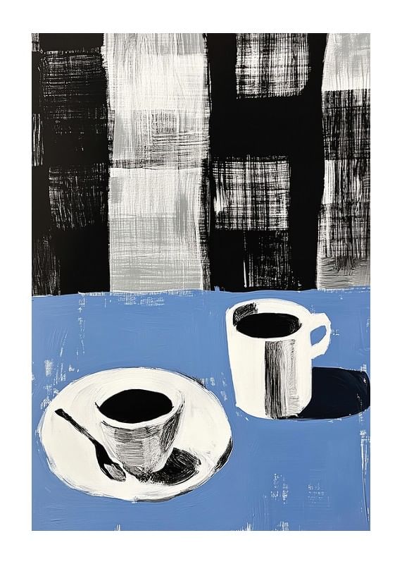 Questo poster cattura l'elegante momento del caffè con un'emozionante espressione grafica in cui i contrasti tra nero, bianco e blu creano un'armonia di stile. Due tazze di caffè sono esposte in bella vista, invitando a un momento di silenzio e riflessione.
