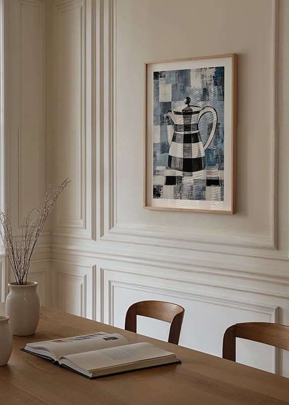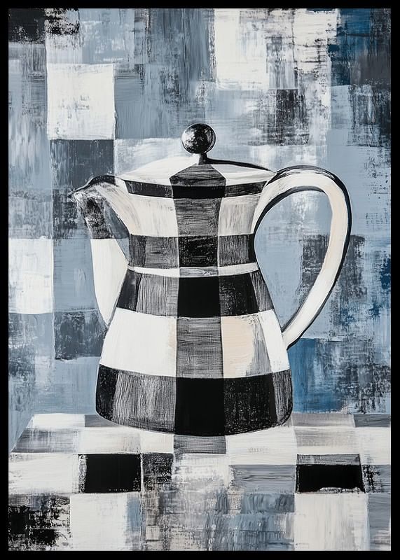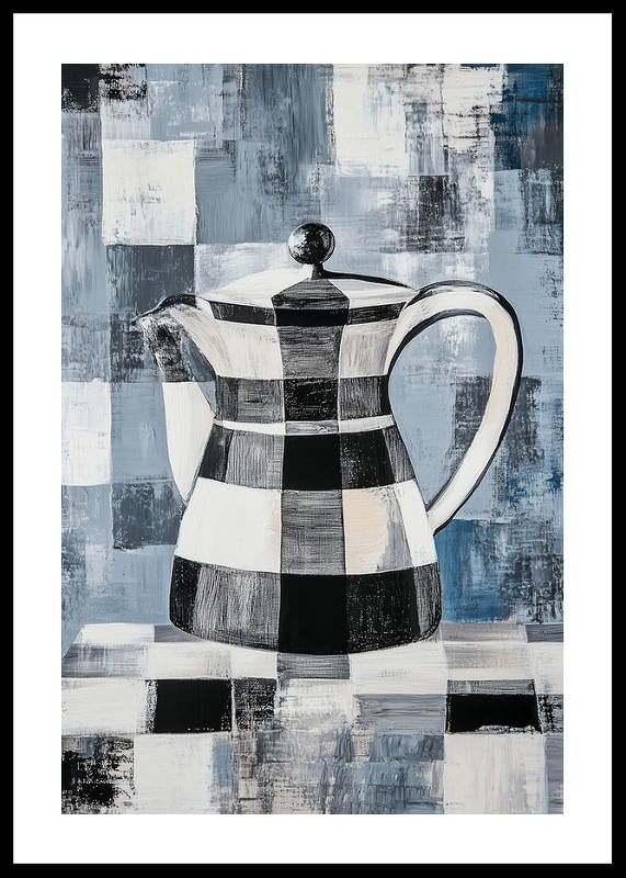 Un poster che unisce l'arte astratta e il design senza tempo. Il motivo a scacchi bianchi e neri di un'elegante brocca si fonde con uno sfondo dai toni blu intenso e dalle forme geometriche.